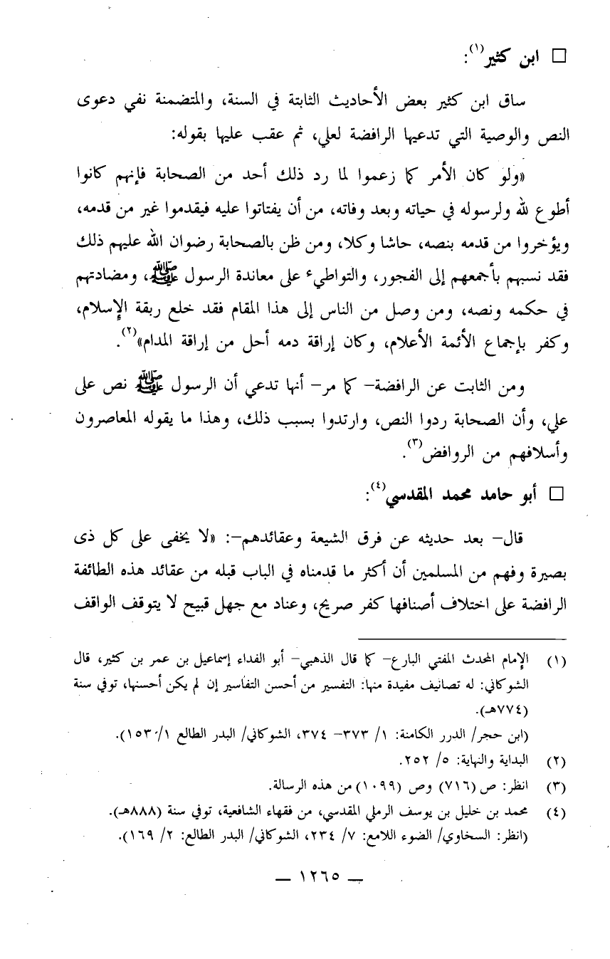 "ولو كان الأمر كما زعموا لما رد ذلك أحد من الصحابة فإنهم كانوا أطوع لله ولرسوله في حياته وبعد وفاته، من أن يفتاتوا عليه فيقدموا غير من قدمه، ويؤخروا من قدمه بنصه، حاشا وكلا، ومن ظن بالصحابة رضوان الله عليهم ذلك فقد نسبهم بأجمعهم إلى الفجور، والتواطؤ على معاندة الرسول صلى الله عليه وسلم، ومضادتهم في حكمه ونصه، ومن وصل من الناس إلى هذا المقام فقد خلع ربقة الإسلام، وكفر بإجماع الأئمة الأعلام، وكان إراقة دمه أحل من إراقة المدام" (¬2) .