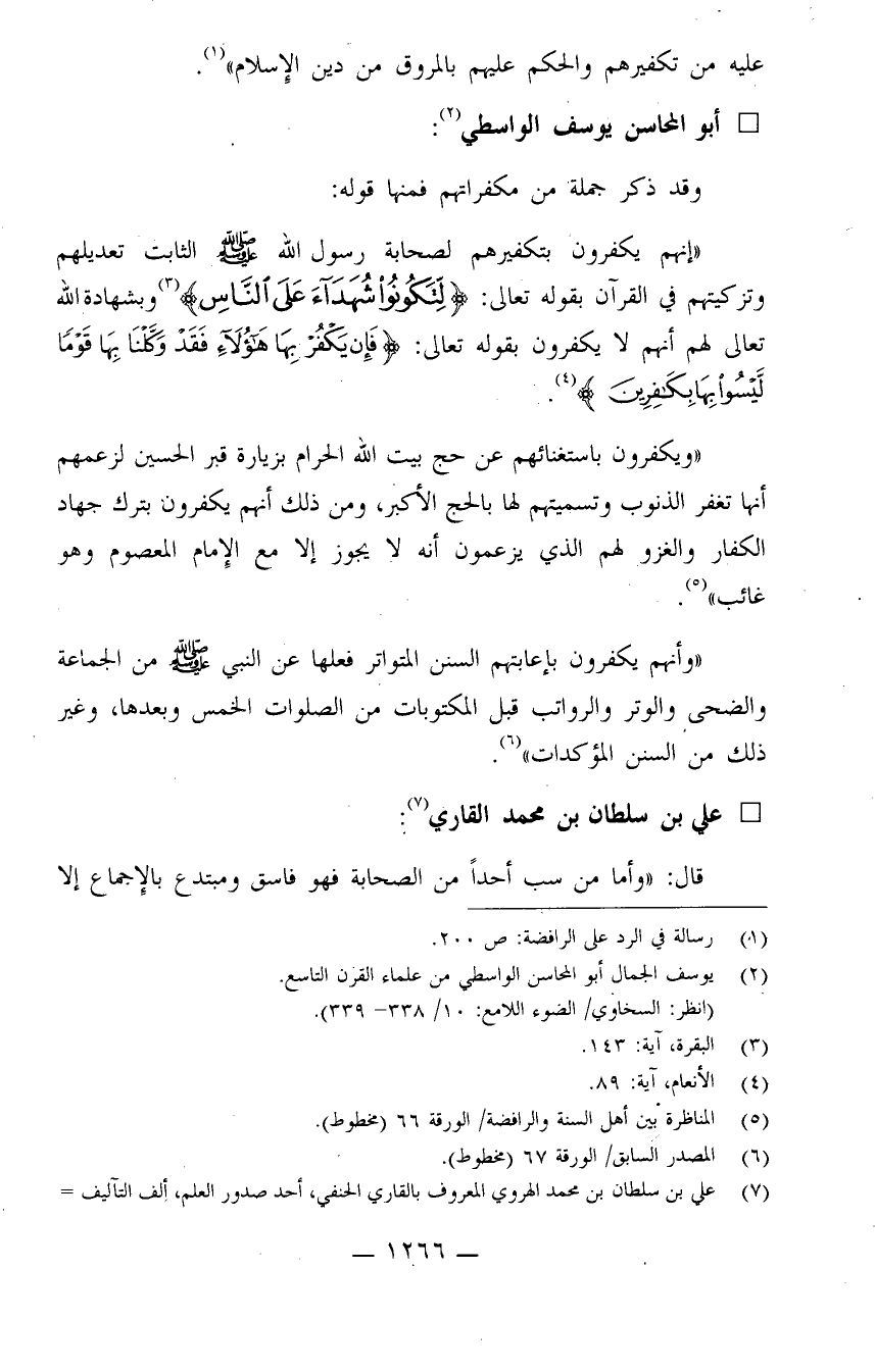 "إنهم يكفرون بتكفيرهم لصحابة سول الله صلى الله عليه وسلم الثابت تعديلهم وتزكيتهم في القرآن بقوله تعالى: {لِّتَكُونُواْ شُهَدَاءَ عَلَى النَّاسِ} (¬3) وبشهادة الله تعالى لهم أنهم لا يكفرون بقوله تعالى: {فَإِن يَكْفُرْ بِهَا هَؤُلاءِ فَقَدْ وَكَّلْنَا بِهَا قَوْمًا لَّيْسُواْ بِهَا بِكَافِرِينَ} (¬4) .