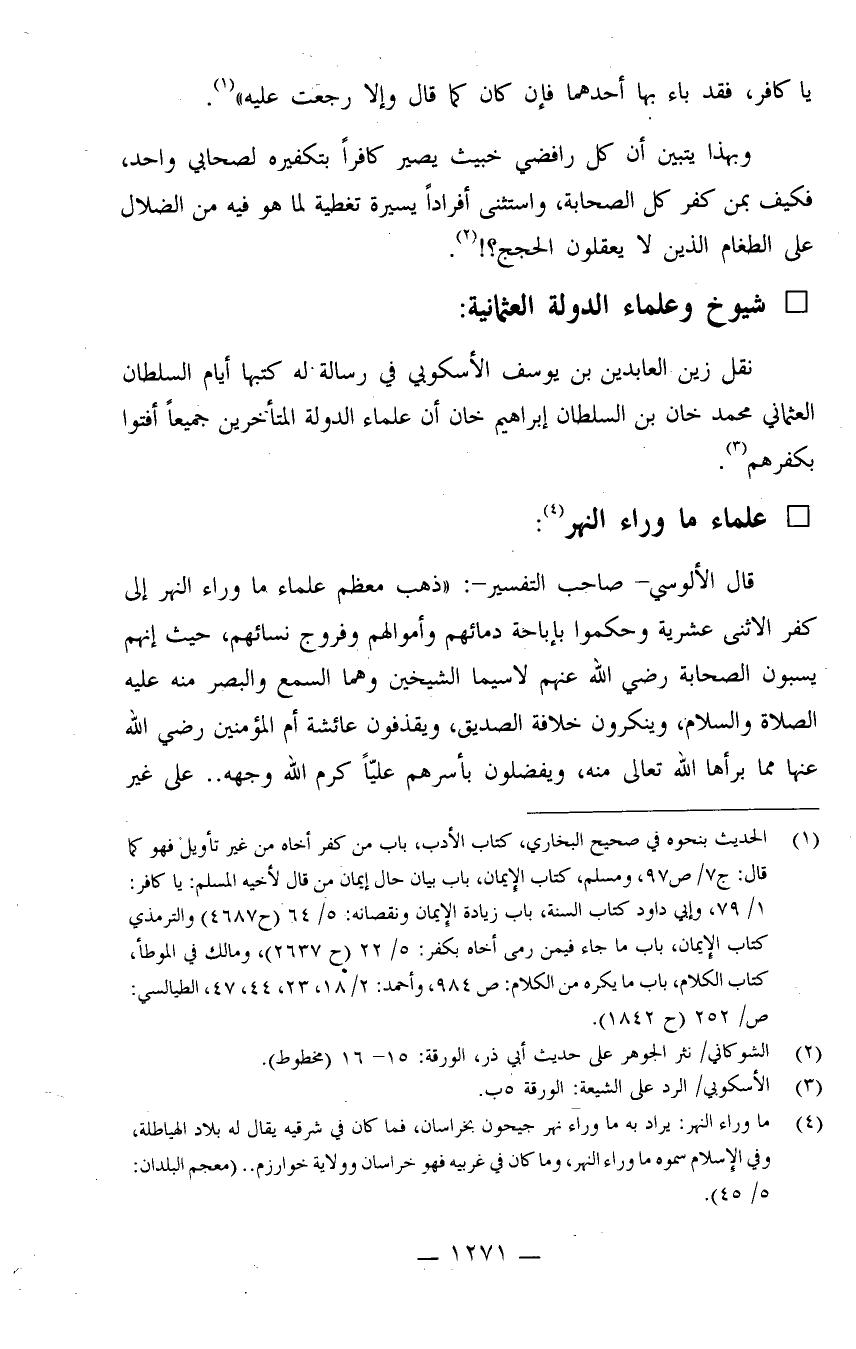 قال الألوسي - صاحب التفسير -: "ذهب معظم علماء ما وراء النهر إلى كفر الاثني عشرية وحكموا بإباحة دمائهم وأموالهم وفروج نسائهم، حيث إنهم يسبون الصحابة رضي الله عنهم لا سيما الشيخين وهما السمع والبصر منه عليه الصلاة والسلام، وينكرون خلافة الصديق، ويقذفون عائشة أم المؤمنين رضي الله عنها مما برأها الله تعالى منه، ويفضلون بأسرهم علياً كرم الله وجه.. على غير