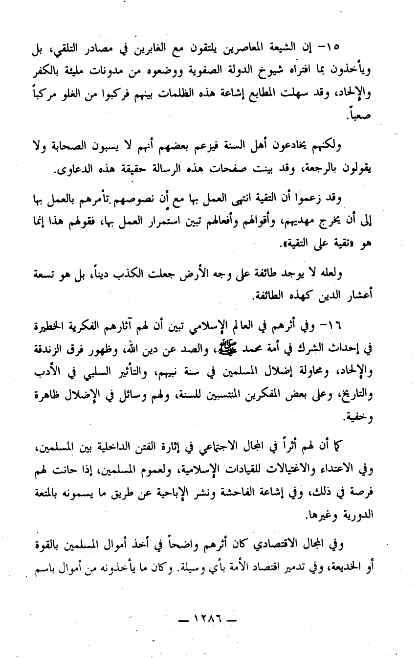 15- إن الشيعة المعاصرين يلتقون مع الغابرين في مصادر التلقي، بل ويأخذون بما افتراه شيوخ الدولة الصفوية ووضعوه من مدونات مليئة بالكفر والإلحاد، وقد سهلت المطابع إشاعة هذه الظلمات بينهم فركبوا من الغلو مركباً صعباً.