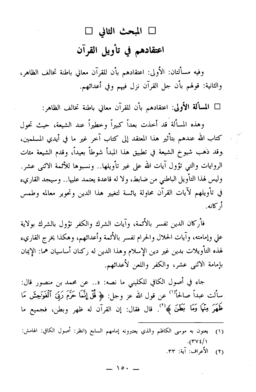 وفيه مسألتان: الأولى: اعتقادهم بأن للقرآن معاني باطنة تخالف الظاهر، والثانية: قولهم بأن جل القرآن نزل فيهم وفي أعدائهم.