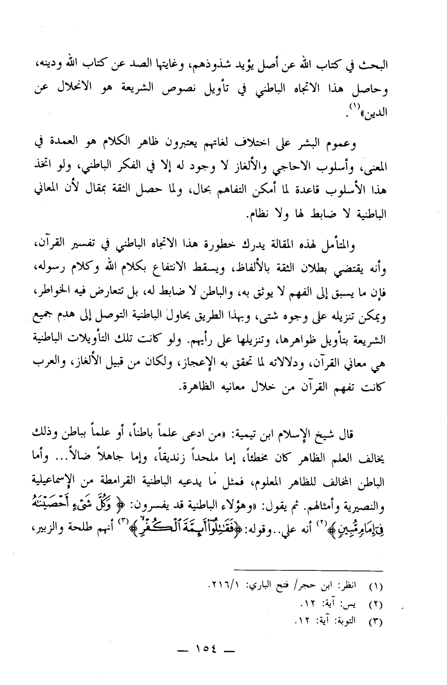 والمتأمل لهذه المقالة يدرك خطورة هذا الاتجاه الباطني في تفسير القرآن، وأنه يقتضي بطلان الثقة بالألفاظ، ويسقط الانتفاع بكلام الله وكلام رسوله، فإن ما يسبق إلى الفهم لا يوثق به، والباطن لا ضابط له، بل تتعارض فيه الخواطر، ويمكن تنزيله على وجوه شتى، وبهذا الطريق يحاول الباطنية التوصل إلى هدم جميع الشريعة بتأويل ظواهرها، وتنزيلها على رأيهم. ولو كانت تلك التأويلات الباطنية هي معاني القرآن، ودلالاتها لما تحقق به الإعجاز، ولكن من قبيل الألغاز، والعرب كانت تفهم القرآن من خلال معانيه الظاهرة.