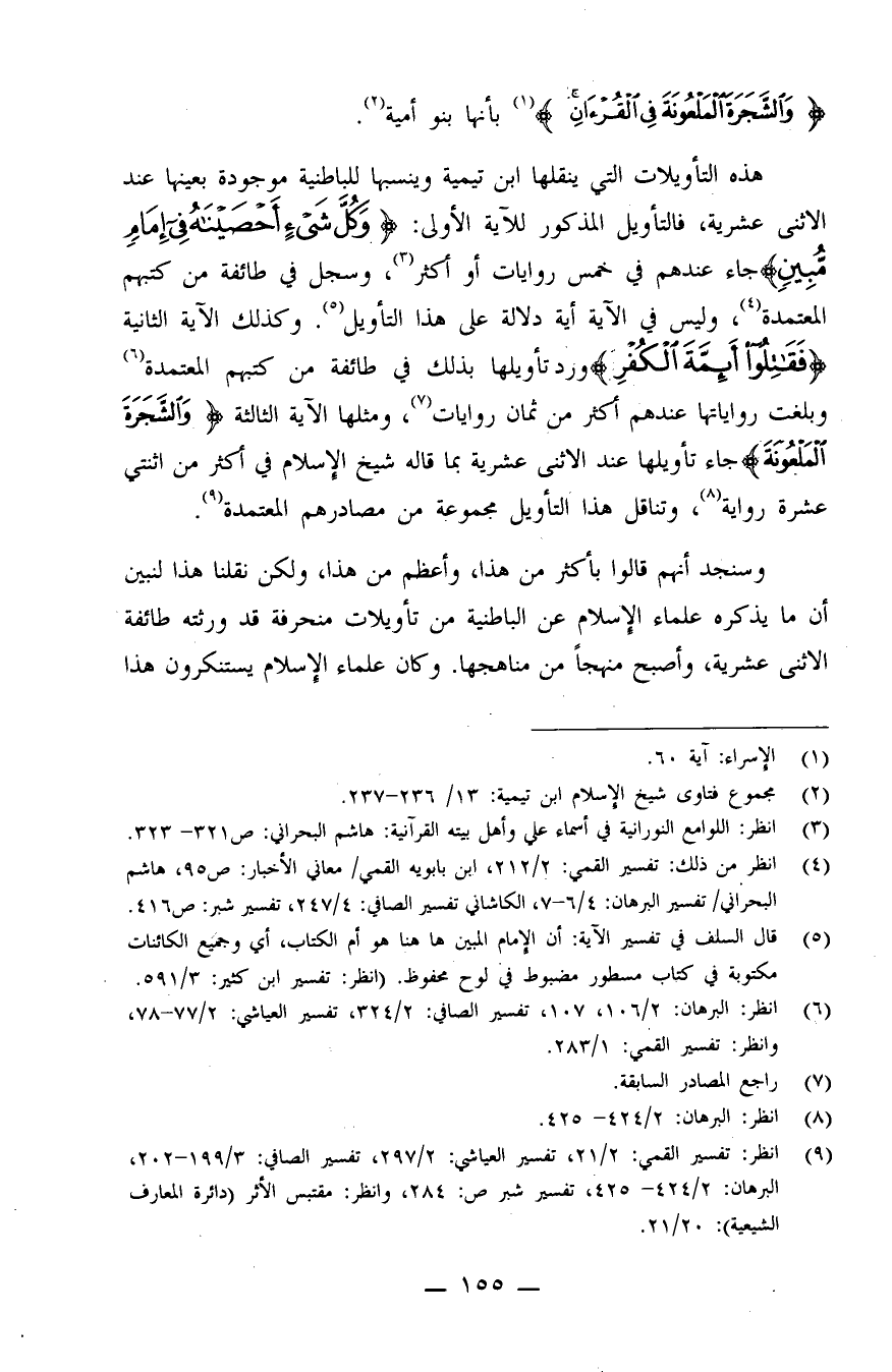 هذه التأويلات التي ينقلها ابن تيمية وينسبها للباطنية موجودة بعينها عند الاثني عشرية، فالتأويل المذكور للآية الأولى: {وَكُلَّ شَيْءٍ أحْصَيْنَاهُ فِي إِمَامٍ مُبِينٍ} جاء عندهم في خمس روايات أو أكثر (¬3) ، وسجل في طائفة من كتبهم المعتمدة (¬4) ، وليس في الآية أية دلالة على هذا التأويل (¬5) . وكذلك الآية الثانية: {فَقَاتِلُواْ أَئِمَّةَ الْكُفْرِ} ورد تأويلها بذلك في طائفة من كتبهم المعتمدة (¬6) . وبلغت رواياتها عندهم أكثر من ثمان روايات (¬7) ، ومثلها الآية الثالثة: {وَالشَّجَرَةَ الْمَلْعُونَةَ} جاء تأويلها عند الاثني عشرية بما قاله شيخ الإسلام في أكثر من اثنتي عشرة رواية (¬8) ، وتناقل هذا التأويل مجموعة من مصادرهم المعتمدة (¬9) .