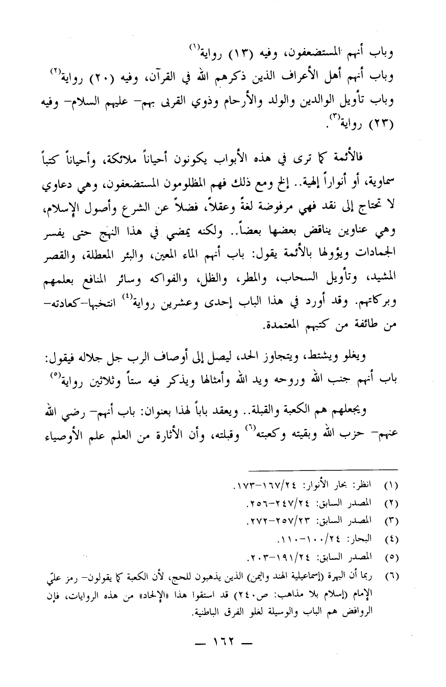 فالأئمة كما ترى في هذه الأبواب يكونون أحياناً ملائكة، وأحياناً كتباً سماوية، أو أنوارًا إلهية.. إلخ، ومع ذلك فهم المظلومون والمستضعفون، وهي دعاوي لا تحتاج إلى نقد فهي مرفوضة لغة وعقلاً، فضلاً عن الشرع وأصول الإسلام، وهي عناوين يناقض بعضها بعضاً.. ولكنه يمضي في هذا النهج حتى يفسر الجمادات ويؤولها بالأئمة، يقول: باب أنهم الماء المعين، والبئر المعطلة، والقصر المشيد، وتأويل السحاب، والمطر، والظل، والفواكه وسائر المنافع بعلمهم وبركاتهم. وقد أورد في هذا الباب إحدى وعشرين رواية (¬4) . انتخبها - كعادته - من طائفة من كتبهم المعتمدة.