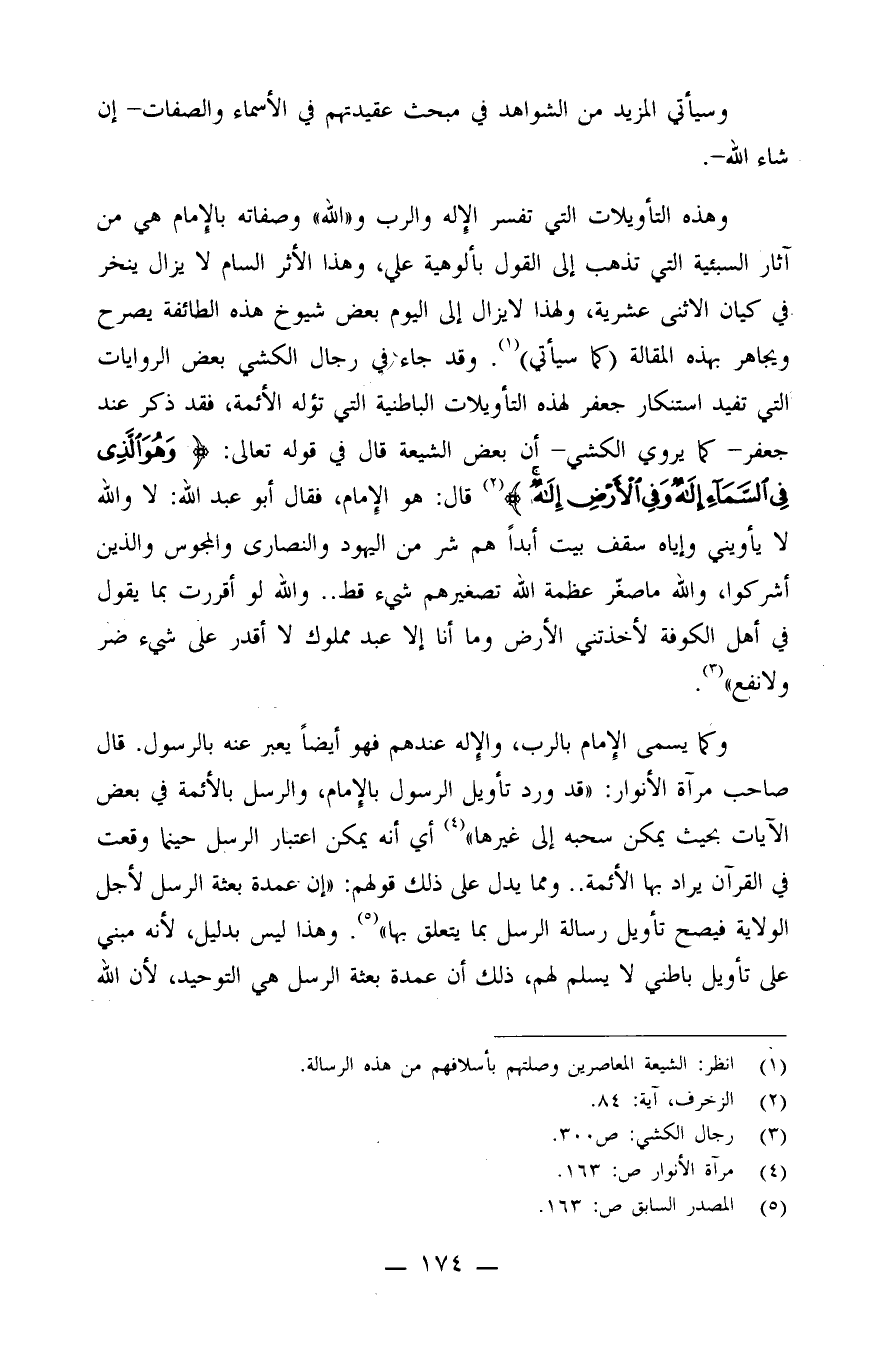 وهذه التأويلات التي تفسر الإله والرب و"الله" وصفاته بالإمام هي من آثار السبئية التي تذهب إلى القول بألوهية علي، وهذا الأثر السام لا يزال ينخر في كيان الاثني عشرية، ولهذا لا يزال إلى اليوم بعض شيوخ هذه الطائفة يصرح ويجاهر بهذه المقالة (كما سيأتي) (¬1) . وقد جاء في رجال الكشي بعض الروايات التي تفيد استنكار جعفر لهذه التأويلات الباطنية التي تؤله الأئمة، فقد ذكر عند جعفر - كما يروي الكشي - أن بعض الشيعة قال في قوله تعالى: {وَهُوَ الَّذِي فِي السَّمَاءِ إِلَهٌ وَفِي الأَرْضِ إِلَهٌ} (¬2) . قال: هو الإمام، فقال أبو عبد الله: "لا والله لا يأويني وإياه سقف بيت أبدًا، هم شر من اليهود والنصارى والمجوس والذين أشركوا، والله ما صغّر عظمة الله تصغيرهم شيء قط.. والله لو أقررت بما يقول في أهل الكوفة لأخذتني الأرض وما أنا إلا عبد مملوك لا أقدر على شيء ضر ولا نفع" (¬3) .