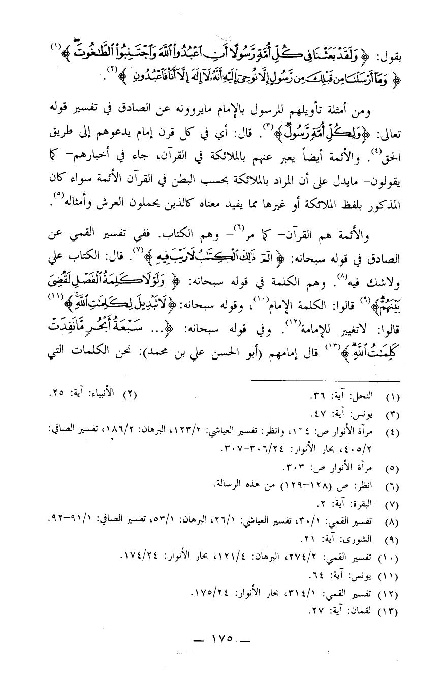 والأئمة هم القرآن - كما مر (¬6) . - وهم الكتاب، ففي تفسير القمي عن الصادق في قوله سبحانه: {الم~، ذَلِكَ الْكِتَابُ لاَ رَيْبَ فِيهِ} (¬7) . قال: الكتاب علي ولا شك فيه (¬8) . وهم الكلمة في قوله سبحانه: {وَلَوْلا كَلِمَةُ الْفَصْلِ لَقُضِيَ بَيْنَهُمْ} (¬9) . قالوا: الكلمة الإمام (¬10) ، وقوله سبحانه: {لاَ تَبْدِيلَ لِكَلِمَاتِ اللَّهِ} (¬11) . قالوا: لا تغيير للإمامة (¬12) . وفي قوله سبحانه: {سَبْعَةُ أَبْحُرٍ مَّا نَفِدَتْ كَلِمَاتُ اللَّهِ} (¬13) . قال إمامهم (أبو الحسن علي بن محمد) : نحن الكلمات التي
