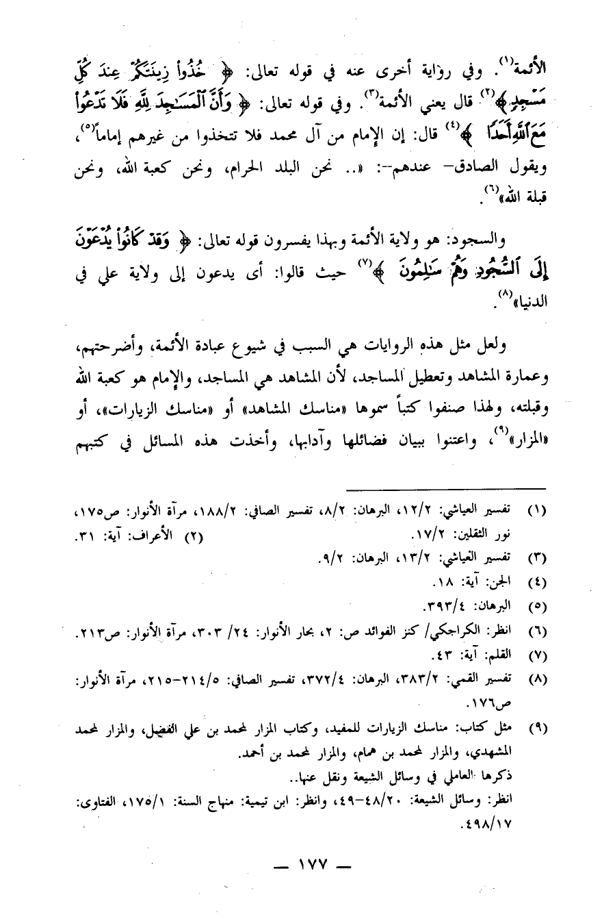 ولعل مثل هذه الروايات هي السبب في شيوع عبادة الأئمة، وأضرحتهم، وعمارة المشاهد وتعطيل المساجد، لأن المشاهد هي المساجد، والإمام هو كعبة الله وقبلته، ولهذا صنفوا كتباً سموها: "مناسك المشاهد" أو "مناسك الزيارات"، أو "المزار" (¬9) ، واعتنوا ببيان فضائلها وآدابها، وأخذت هذه المسائل في كتبهم