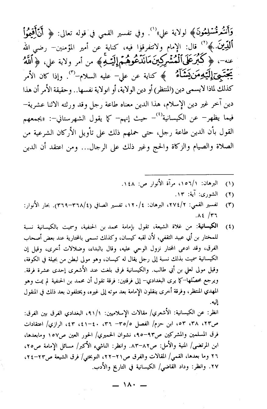 وَأَنتُم مُّسْلِمُونَ} لولاية علي" (¬1) . وفي تفسير القمي في قوله تعالى: {أَنْ أَقِيمُوا الدِّينَ..} (¬2) . قال: الإمام، {وَلا تَتَفَرَّقُوا فِيهِ} ، كناية عن أمير المؤمنين - رضي الله عنه -، {كَبُرَ عَلَى الْمُشْرِكِينَ مَا تَدْعُوهُمْ إِلَيْهِ} من أمر ولاية علي، {اللَّهُ يَجْتَبِي إِلَيْهِ مَن يَشَاءُ} كناية عن علي - عليه السلام - (¬3) .