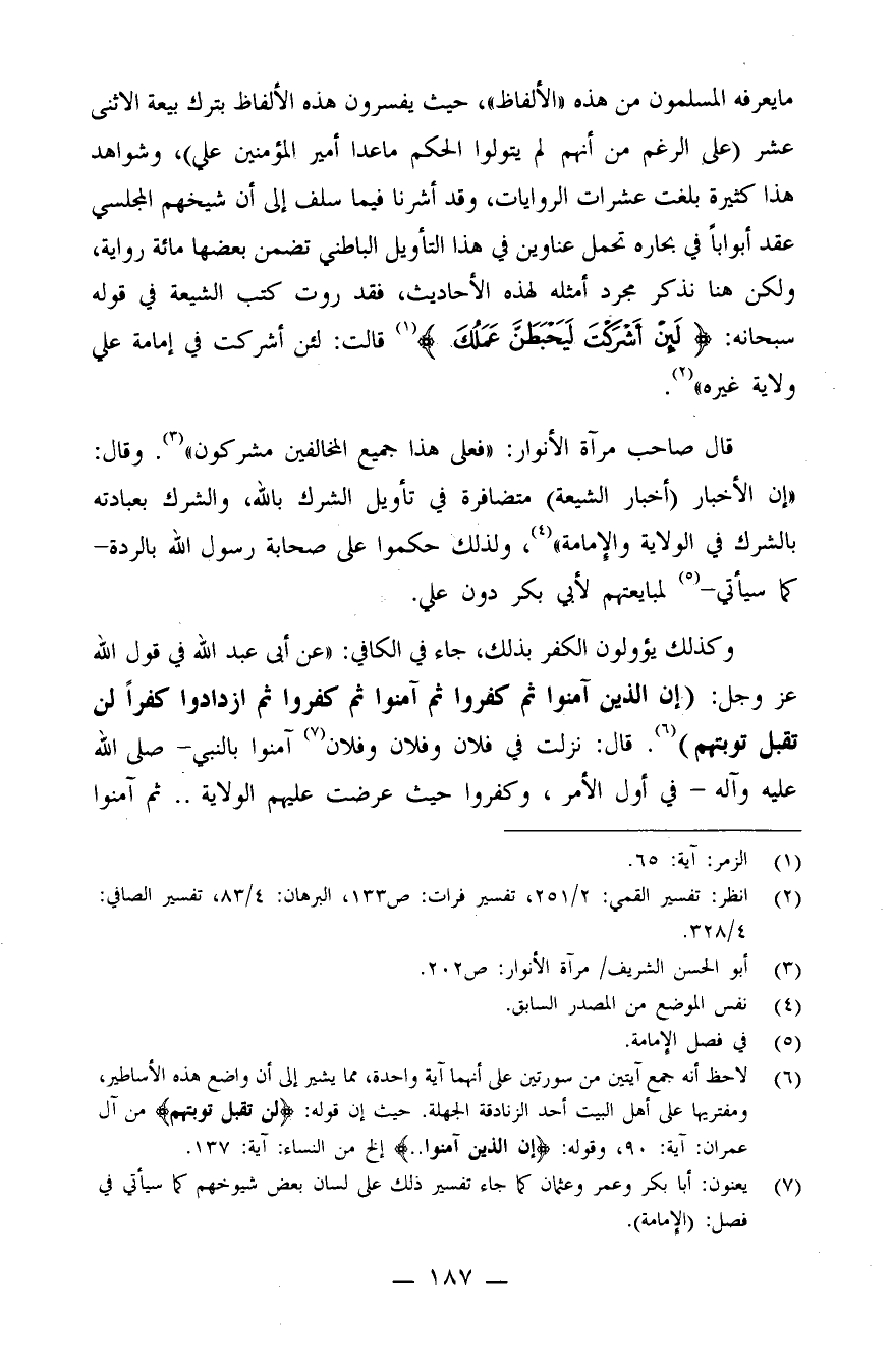 (¬6) لاحظ أنه جمع آيتين من سورتين على أنهما آية واحدة، مما يشير إلى أن واضع هذه الأساطير، ومفتريها على أهل البيت أحد الزنادقة الجهلة؛ حيث إن قوله: {لَّن تُقْبَلَ تَوْبَتُهُمْ} من آل عمران، آية: 90، وقوله: {إِنَّ الَّذِينَ آمَنُواْ..} إلخ من النساء، آية: 137