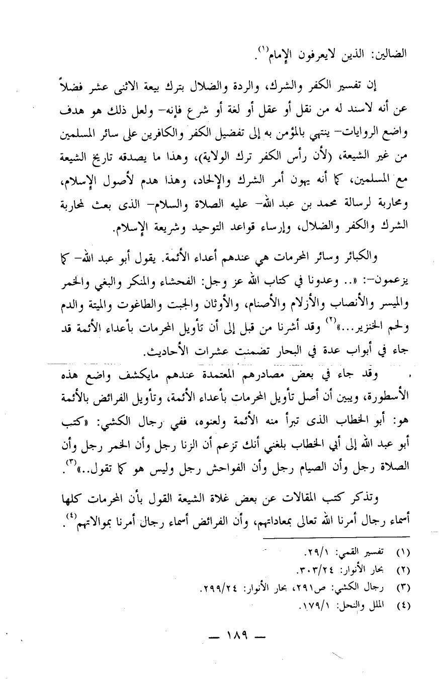 والكبائر وسائر المحرمات هي عندهم أعداء الأئمة. يقول أبو عبد الله - كما يزعمون -: "..وعدونا في كتاب الله عز وجل: الفحشاء والمنكر والبغي والخمر والميسر والأنصاب والأزلام والأصنام، والأوثان والجبت والطاغوت والميتة والدم ولحم الخنزير.." (¬2) . وقد أشرنا من قبل إلى أن تأويل المحرمات بأعداء الأئمة قد جاء في أبواب عدة في البحار تضمنت عشرات الأحاديث.
