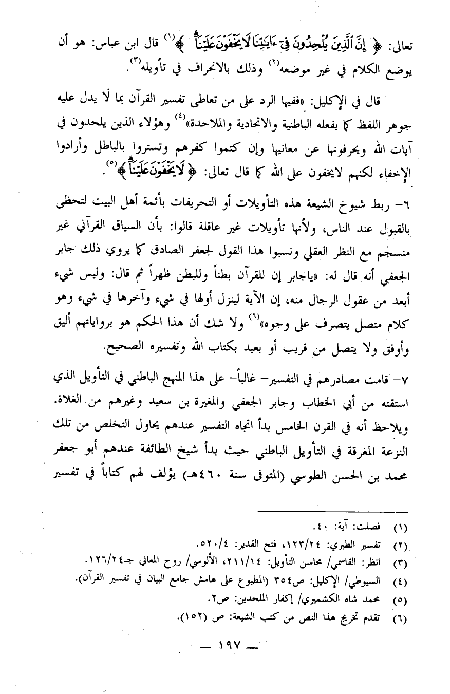 7- قامت مصادرهم في التفسير - غالباً - على هذا المنهج الباطني في التأويل الذي استقته من أبي الخطاب وجابر الجعفي والمغيرة بن سعيد وغيرهم من الغلاة. ويلاحظ أنه في القرن الخامس بدأ اتجاه التفسير عندهم يحاول التخلص من تلك النزعة المغرقة في التأويل الباطني؛ حيث بدأ شيخ الطائفة عندهم أبو جعفر محمد بن الحسن الطوسي (المتوفى سنة 460هـ) يؤلف لهم كتاباً في تفسير القرآن