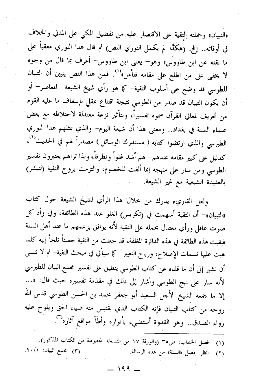 فمن هذا النص يتبين أن التبيان للطوسي قد وضع على أسلوب التقية - كما هو رأي شيخ الشيعة المعاصر - أو أن يكون التبيان قد صدر من الطوسي نتيجة اقتناع عقلي بإسفاف ما عليه القوم من تحريف لمعاني القرآن سموه تفسيراً، وبتأثير نزعة معتدلة لاختلاطه مع بعض علماء السنة في بغداد.. ومعنى هذا أن شيعة اليوم - والذي يمثلهم هذا النوري الطبرسي والذي ارتضوا كتابه (مستدرك الوسائل) مصدراً لهم في الحديث (¬2) ، كدليل على كبير مقامهم عندهم - هم أشد غلواً وتطرفاً، ولذا تراهم يعتبرون تفسير الطوسي ومن سار على منهجه إنما ألفت للخصوم، والتزمت بروح التقية (لتبشر) بالعقيدة الشيعية مع غير الشيعة.