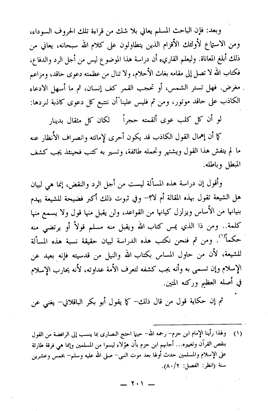 (¬1) ولهذا رأينا الإمام بن احزم - رحمه الله - حينما احتج النصارى بما ينسب إلى الرافضة من القول بنقص القرآن وتغييره.. أجابهم ابن حزم بأن هؤلاء ليسوا من المسلمين وإنما هي فرقة طارئة على الإسلام والمسلمين حدث أولها بعد موت النبي صلى الله عليه وسلم بخمس وعشرين سنة. (انظر: الفصل: 2/80)
