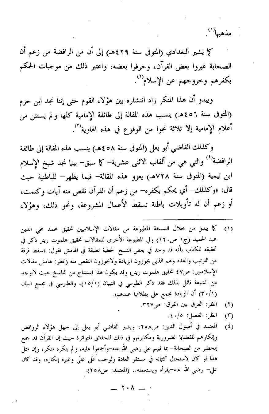 (¬4) المعتمد في أصول الدين: ص 258، ويشير القاضي أبو يعلى إلى جهل هؤلاء الروافض وإنكارهم للقضايا الضرورية ومكابرتهم في ذلك للحقاق المتواترة؛ حيث إن القرآن قد جمع بمحضر من الصحابة - بما فيهم علي رضي الله عنه - وأجمعوا عليه، ولم ينكره منكر، وإن مثل هذا لو كان لاستحال كتمانه في مستقر العادة، ولوجب على عليّ وغيره إنكاره، وقد كان علي - رضي الله عنه - يقرأه ويستعمله.. (المعتمد: ص258)