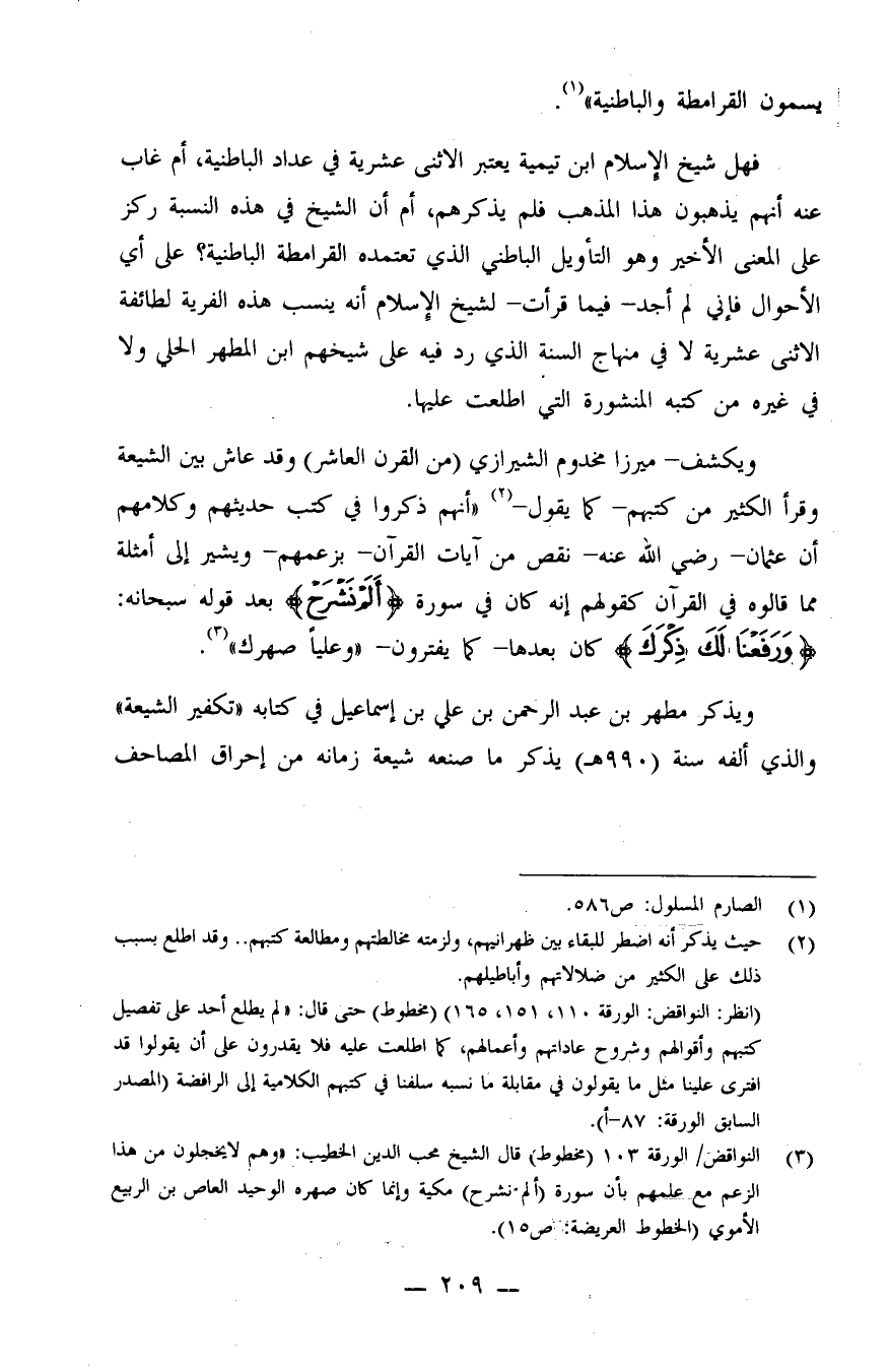 ويكشف - ميرزا مخدوم الشيرازي (من القرن العاشر) وقد عاش بين الشيعة وقرأ الكثير من كتبهم - كما يقول (¬2) .- "أنهم ذكروا في كتب حديثهم وكلامهم أن عثمان - رضي الله عنه - نقص من آيات القرآن - بزعمهم - ويشير إلى أمثلة مما قالوه في القرآن كقولهم: إنه كان في سورة {أَلَمْ نَشْرَحْ} بعد قوله سبحانه: {وَرَفَعْنَا لَكَ ذِكْرَكَ} كان بعدها - كما يفترون - "وعلياً صهرك" (¬3) .