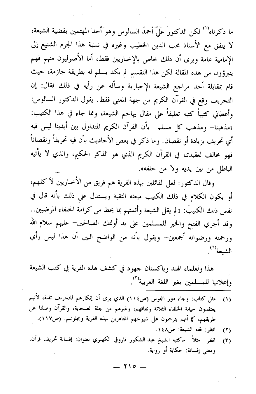 (¬1) مثل كتاب: وجاء دور المجوس (ص114) الذي يرى أنه إنكارهم للتحريف تقية، لأنهم يعتقدون خيانة الخلفاء الثلاثة ونفاقهم، وغيرهم من جلة الصحابة، والقرآن وصلنا عن طريقهم، كما أنهم يترحمون على شيوخهم المجاهرين بهذه الفرية ويجلونهم. (ص117)