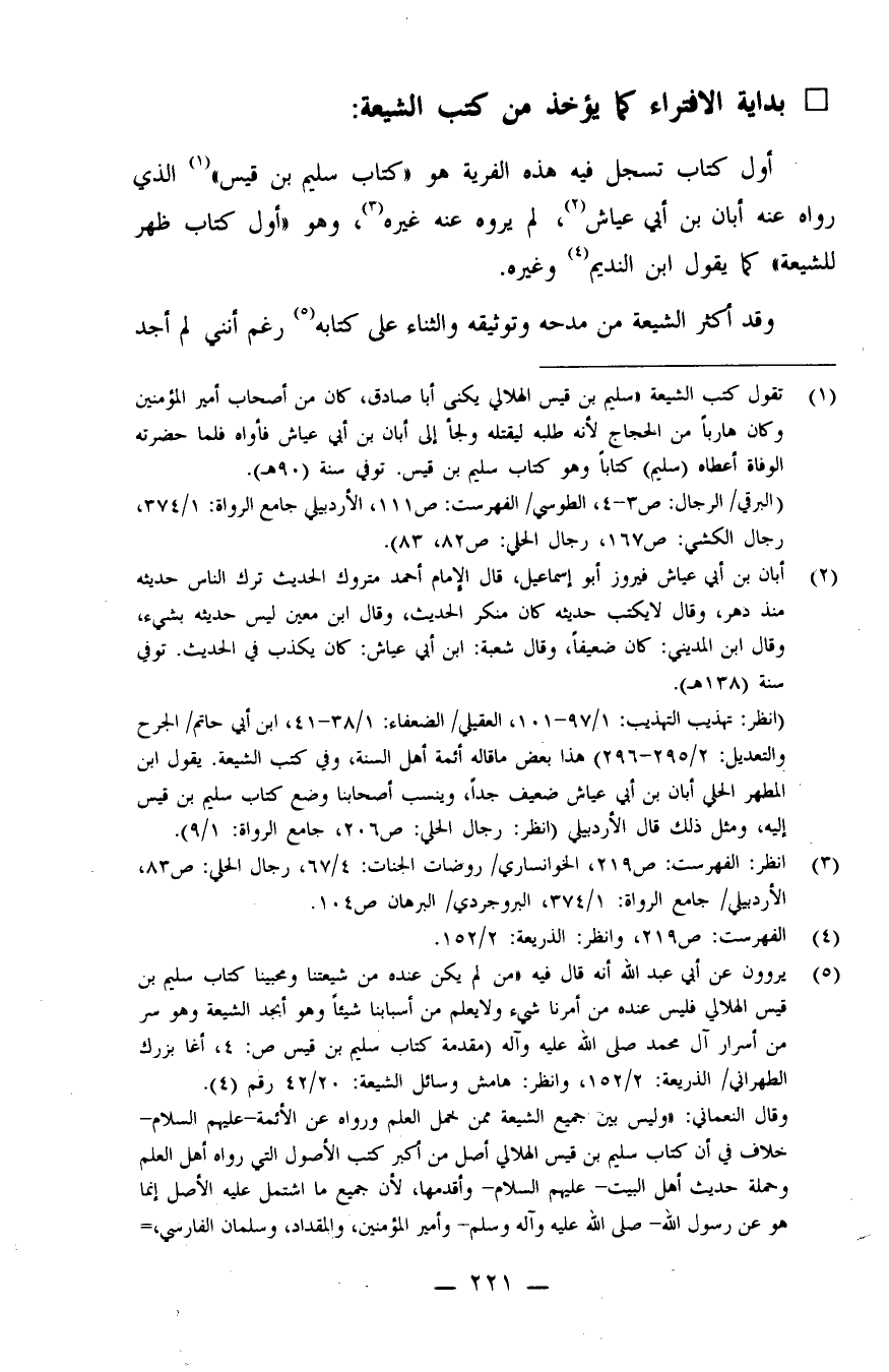 (¬5) يروون عن أبي عبد الله أنه قال فيه: "من لم يكن عنده من شيعتنا ومحبينا كتاب سليم ابن قيس الهلالي فليس عنده من أمرنا شيء ولا يعلم من أسبابنا شيئاً، وهو أبجد الشيعة وهو سر من أسرار آل محمد صلى الله عليه وآله" مقدمة كتاب سليم بن قيس ص: 4، أغا بزرك الطهراني/ الذريعة: 2/152، وانظر: هامش وسائل الشيعة: 2/42 رقم (4) .