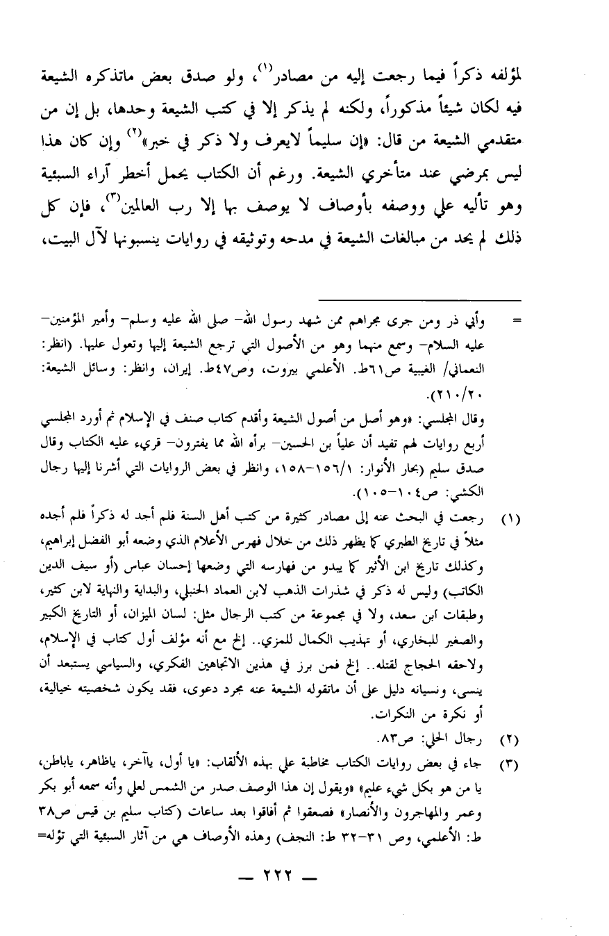 لمؤلفه ذكراً فيما رجعت إليه من مصادر (¬1) ، ولو صدق بعض ما تذكره الشيعة فيه لكان شيئاً مذكوراً، ولكنه لم يذكر إلا في كتب الشيعة وحدها، بل إن من متقدمي الشيعة من قال: "إن سليماً لا يعرف ولا ذكر في خبر" (¬2) . وإن كان هذا ليس بمرضي عند متأخري الشيعة. ورغم أن الكتاب يحمل أخطر آراء السبئية وهو تأليه علي ووصفه بأوصاف لا يوصف بها إلا رب العالمين (¬3) . فإن كل ذلك لم يحد من مبالغات الشيعة في مدحه وتوثيقه في روايات ينسبونها لآل البيت،