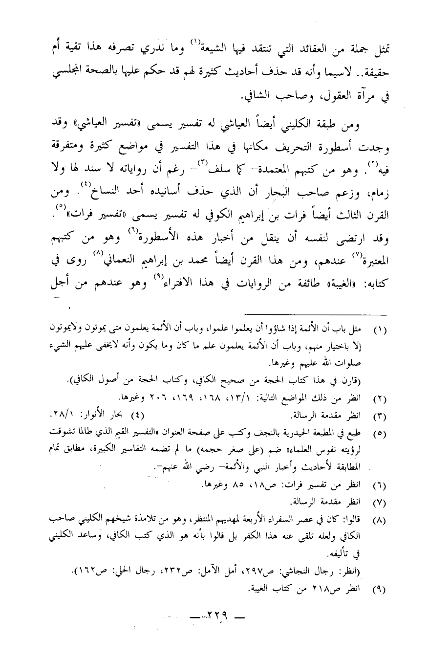ومن طبقة الكليني أيضاً العياشي له تفسير يسمى: "تفسير العياشي" وقد وجدت أسطورة التحريف مكانها في هذا التفسير في مواضع كثيرة ومتفرقة فيه (¬2) . وهو من كتبهم المعتمدة - كما سلف (¬3) .- رغم أن رواياته لا سند لها ولا زمام، وزعم صاحب البحار أن الذي حذف أسانيده أحد النساخ (¬4) .
