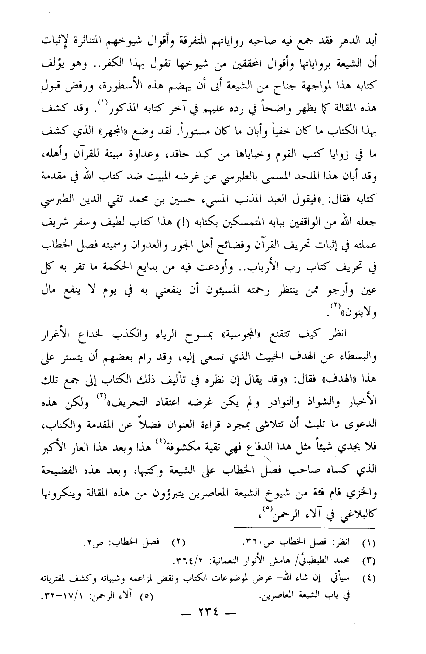 أبد الدهر، فقد جمع فيه صاحبه رواياتهم المتفرقة وأقوال شيوخهم المتناثرة لإثبات أن الشيعة برواياتها وأقوال المحققين من شيوخها تقول بهذا الكفر.. وهو يؤلف كتابه هذا لمواجه جناح من الشيعة أبى أن يهضم هذه الأسطورة، ورفض قبول هذه المقالة كما يظهر واضحاً في رده عليهم في آخر كتابه المذكور (¬1) .