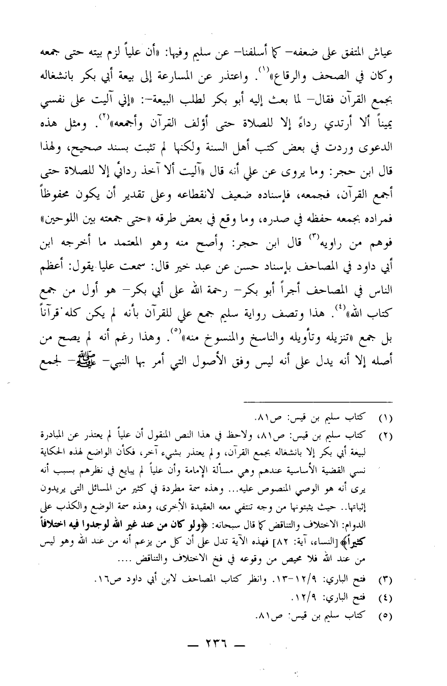 هذا وتصف رواية سليم جمع علي للقرآن بأنه لم يكن كله قرآناً بل جمع "تنزيله وتأويله والناسخ والمنسوخ منه" (¬5) ، وهذا رغم أنه لم يصح من أصله إلا أنه يدل على أنه ليس وفق الأصول التي أمر بها النبي -صلى الله عليه وسلم- لجمع