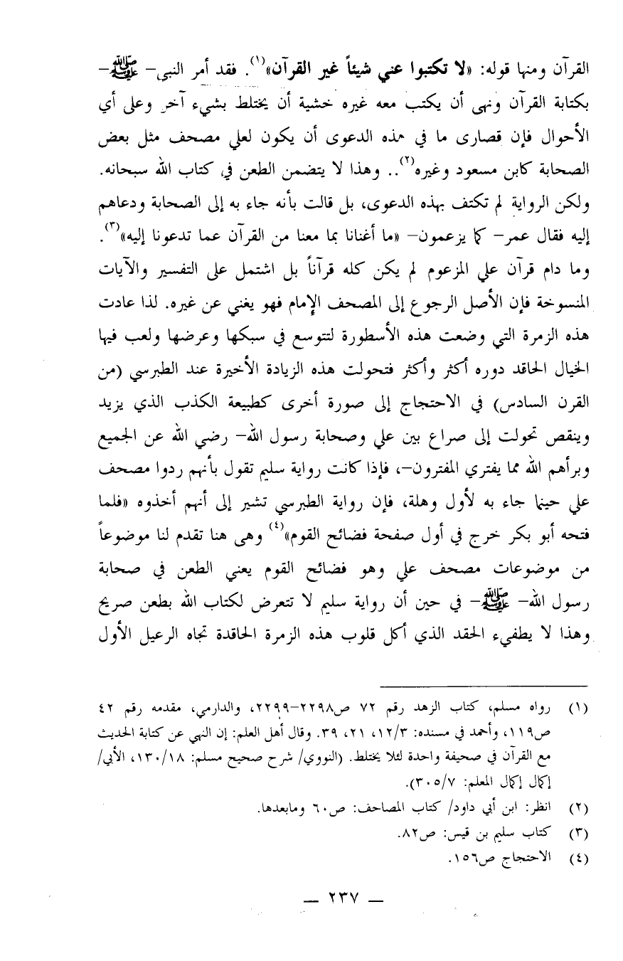 القرآن، ومنها قوله: "لا تكتبوا عني شيئاً غير القرآن" (¬1) . فقد أمر النبي -صلى الله عليه وسلم- بكتابة القرآن ونهى أن يكتب معه غيره خشية أن يختلط بشيء آخر، وعلى أي الأحوال فإن قصارى ما في هذه الدعوى أن يكون لعلي مصحف مثل بعض الصحابة كابن مسعود وغيره (¬2) . وهذا لا يتضمن الطعن في كتاب الله سبحانه.