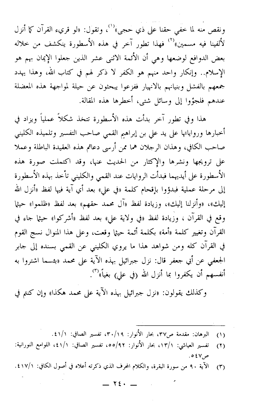 هذا وفي تطور آخر بدأت هذه الأسطورة تتخذ شكلاً عملياً ويزاد في أخبارها ورواياتها على يد علي بن إبراهيم القمي صاحب التفسير وتلميذه الكليني صاحب الكافي، وهذان الرجلان هما ممن أرسى دعائم هذه العقيدة الباطلة وعملا على ترويجها ونشرها والإكثار من الحديث عنها، وقد اكتملت صورة هذه الأسطورة على أيديهما فبدأت الروايات عند القمي والكليني تأخذ بهذه الأسطورة إلى مرحلة عملية فبدؤوا بإقحام كلمة "في علي" بعد أي آية فيها لفظ: "أنزل الله إليك"، "وأنزلنا إليك"، وزيادة لفظ: "آل محمد حقهم" بعد لفظ: "ظلموا" حيثما وقع في القرآن، وزيادة لفظ: "في ولاية علي" بعد لفظ: "أشركوا" حيثما جاء في القرآن، وتغيير كلمة "أمة" بكلمة أئمة حيثما وقعت.