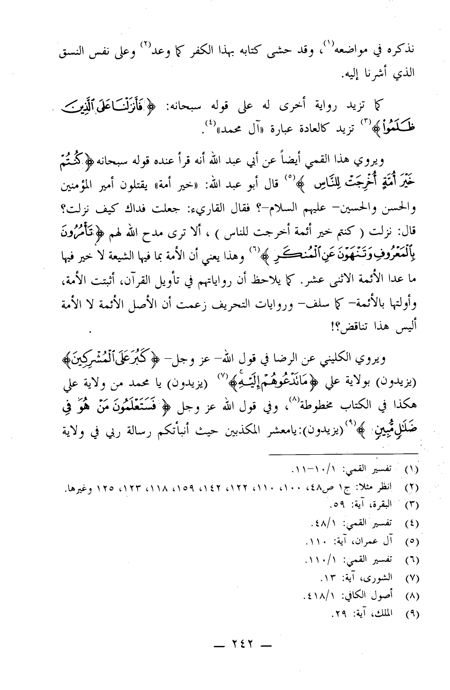 ويروي هذا القمي أيضاً عن أبي عبد الله أنه قرأ عنده قوله سبحانه: {كُنتُمْ خَيْرَ أُمَّةٍ أُخْرِجَتْ لِلنَّاسِ} (¬5) . قال أبو عبد الله: "خير أمة" يقتلون أمير المؤمنين والحسن والحسين - عليهم السلام -؟ فقال القارئ: جعلت فداك كيف نزلت؟ قال: نزلت (كنتم خير أئمة أخرجت للناس) ، ألا ترى مدح الله لهم {تَأْمُرُونَ بِالْمَعْرُوفِ وَتَنْهَوْنَ عَنِ الْمُنكَرِ} " (¬6) . وهذا يعني أن الأمة بما فيها الشيعة لا خير فيها ماعدا الأئمة الاثني عشر. كما يلاحظ أن رواياتهم في تأويل القرآن، أثبتت الأمة، وأولتها بالأئمة - كما سلف - وروايات التحريف زعمت أن الأصل الأئمة لا الأمة أليس هذا تناقضاً؟!