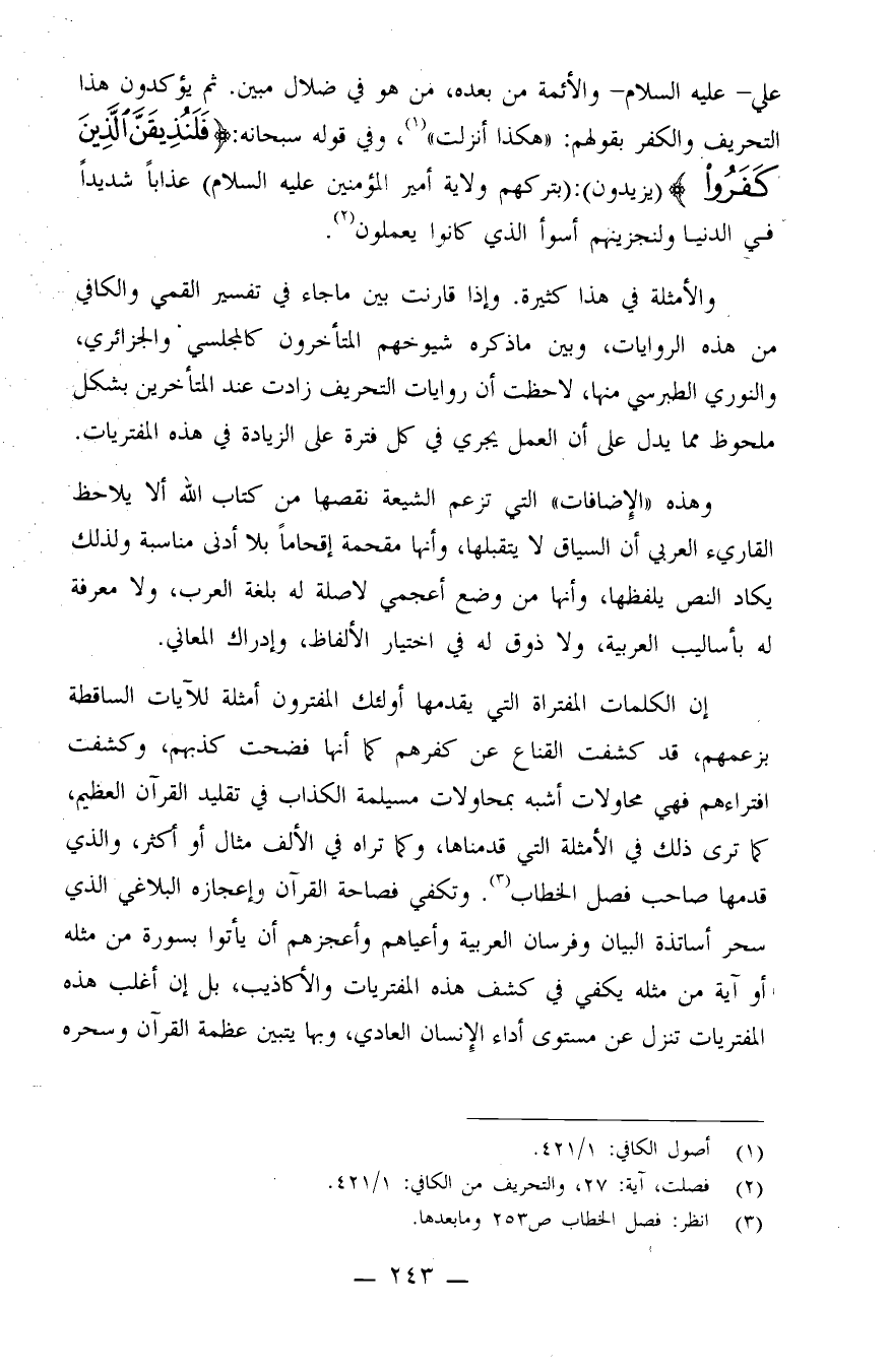 والأمثلة في هذه كثيرة. وإذا قارنت بين ما جاء في تفسير القمي والكافي من هذه الروايات، وبين ما ذكره شيوخهم المتأخرون كالمجلسي والجزائري، والنوري الطبرسي منها، لاحظت أن روايات التحريف زادت عند المتأخرين بشكل ملحوظ مما يدل على أن العمل يجري في كل فترة على الزيادة في هذه المفتريات.