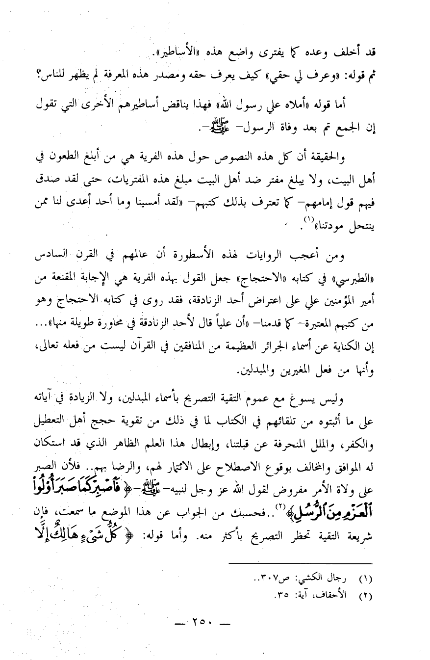 وليس يسوغ مع عموم التقية التصريح بأسماء المبدلين، ولا الزيادة في آياته على ما أثبتوه من تلقائهم في الكتاب لما في ذلك من تقوية حجج أهل التعطيل والكفر، والملل المنحرفة عن قبلتنا، وإبطال هذا العلم الظاهر الذي قد استكان له الموافق والمخالف بوقوع الاصطلاح على الائتمار لهم، والرضا بهم.. فلأن الصبر على ولاة الأمر مفروض لقول الله عز وجل لنبيه صلى الله عليه وسلم: {فَاصْبِرْ كَمَا صَبَرَ أُوْلُوا الْعَزْمِ مِنَ الرُّسُلِ} (¬2) . فحسبك من الجواب عن هذا الموضوع ما سمعت، فإن شريعة التقية تحظر التصريح بأكثر منه.