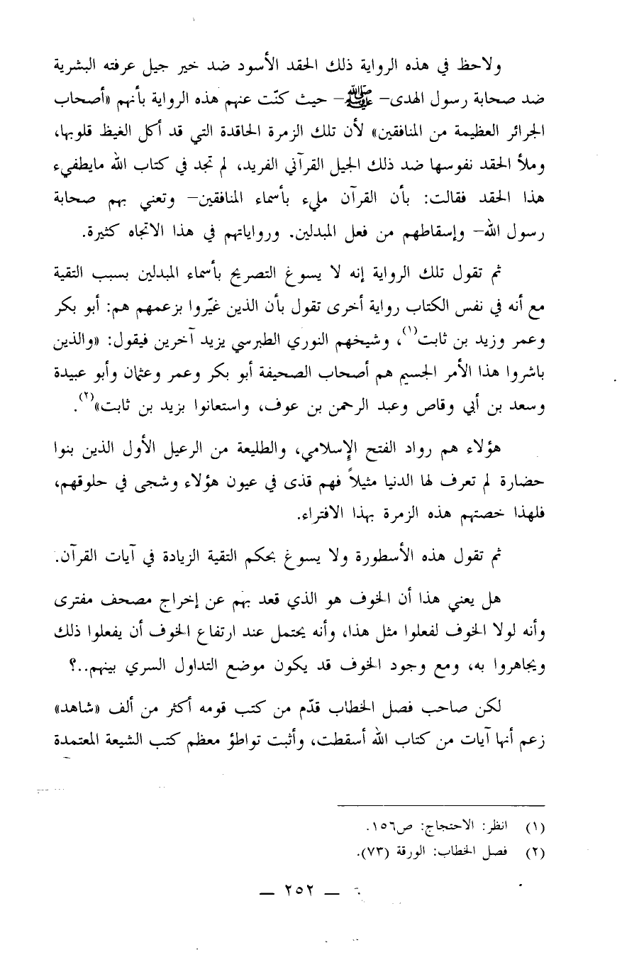 هل يعني هذا أن الخوف هو الذي قعد بهم عن إخراج مصحف مفترى وأنه لولا الخوف لفعلوا مثل هذا، وأنه يحتمل عند ارتفاع الخوف أن يفعلوا ذلك ويجاهروا به، ومع وجود الخوف قد يكون موضع التداول السري بينهم..؟!
