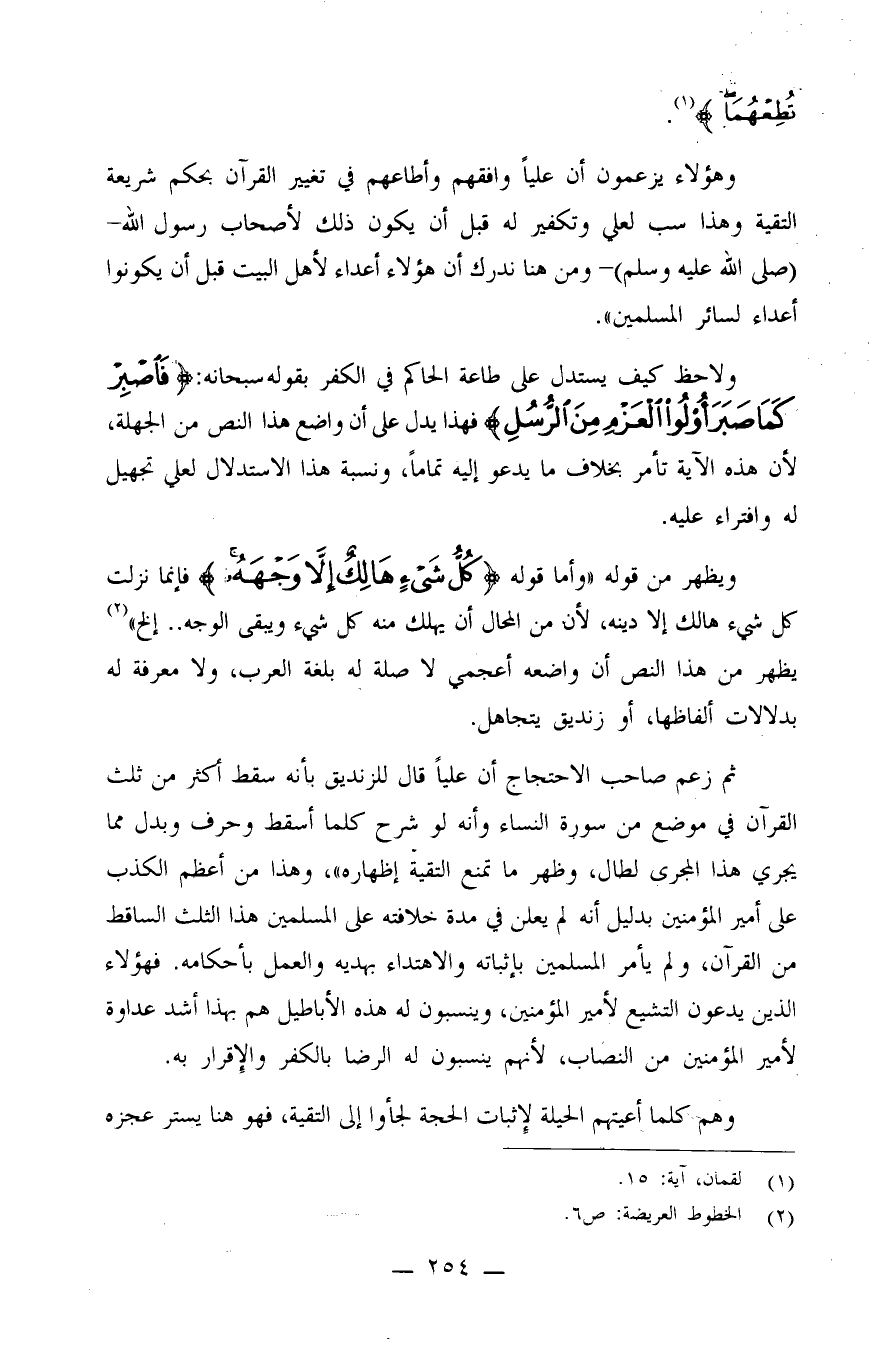 ولاحظ كيف يستدل على طاعة الحاكم في الكفر بقوله سبحانه: {فَاصْبِرْ كَمَا صَبَرَ أُوْلُوا الْعَزْمِ} فهذا يدل على أن واضع هذا النص من الجهلة؛ لأن هذه الآية تأمر بخلاف ما يدعو إليه تماماً، ونسبة هذا الاستدلال لعلي تجهيل له وافتراء عليه.