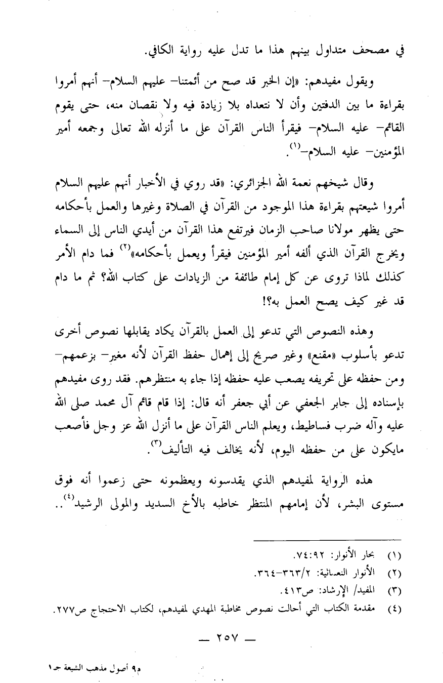 وقال شيخهم نعمة الله الجزائري: "قد روي في الأخبار أنهم عليهم السلام أمروا شيعتهم بقراءة هذا الموجود من القرآن في الصلاة وغيرها والعمل بأحكامه حتى يظهر مولانا صاحب الزمان فيرتفع هذا القرآن من أيدي الناس إلى السماء، ويخرج القرآن الذي ألفه أمير المؤمنين فيقرأ ويعمل بأحكامه" (¬2) . فمادام الأمر كذلك، لماذا تروى عن كل إمام طائفة من الزيادات على كتاب الله؟ ثم ما دام قد غير كيف يصبح العمل به؟!