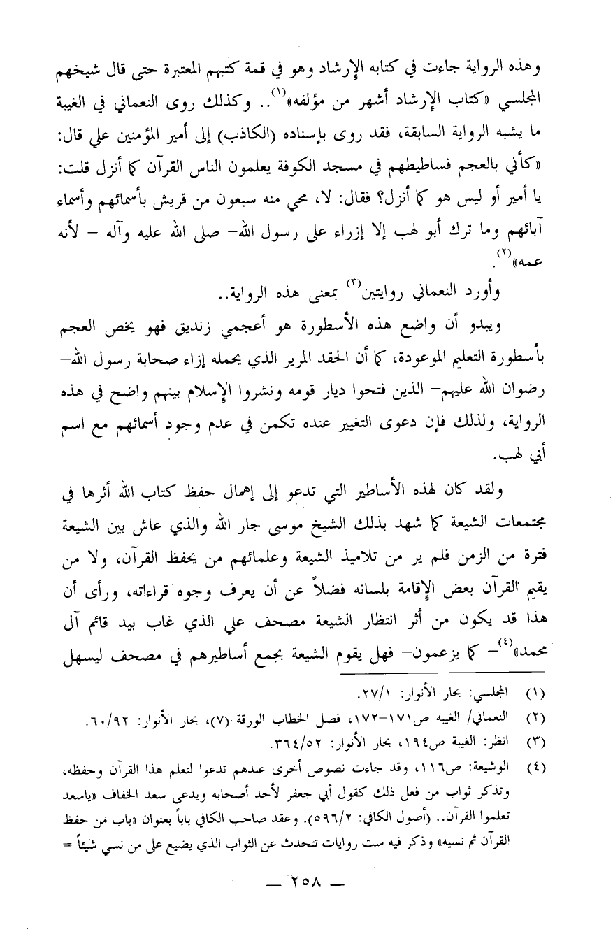 وهذه الرواية جاءت في كتابه الإرشاد وهو في قمة كتبهم المعتبرة حتى قال شيخهم المجلسي: "كتاب الإرشاد أشهر من مؤلفه" (¬1) . وكذلك روى النعماني في الغيبة ما يشبه الرواية السابقة، فقد روى بإسناده (الكاذب) إلى أمير المؤمنين علي قال: "كأني بالعجم فساطيطهم في مسجد الكوفة يعلمون الناس القرآن كما أنزل، قلت: يا أمير أو ليس هو كما أنزل؟ فقال: لا، محي منه سبعون من قريش بأسمائهم وأسماء آبائهم، وما ترك أبو لهب إلا إزراء على رسول الله - صلى الله عليه وآله - لأنه عمه" (¬2) .