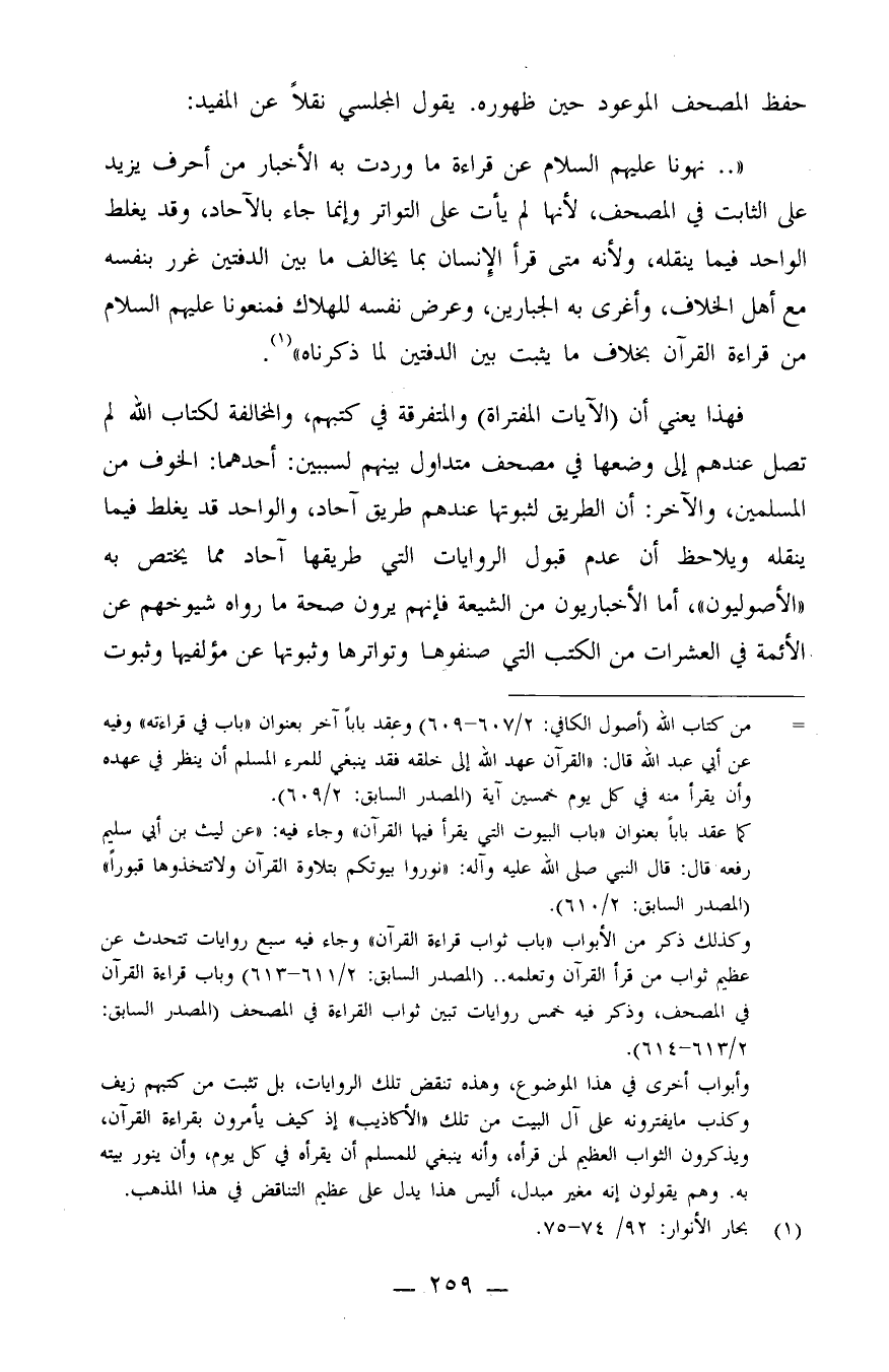 فهذا يعني أن (الآيات المفتراة) والمتفرقة في كتبهم، والمخالفة لكتاب الله لم تصل عندهم إلى وضعها في مصحف متداول بينهم لسببين: أحدهما: الخوف من المسلمين، والآخر: أن الطريق لثبوتها عندهم طريق آحاد، والواحد قد يغلط فيما ينقله، ويلاحظ أن عدم قبول الروايات التي طريقها أحاد مما يختص به "الأصوليون"، أما الأخباريون من الشيعة فإنهم يرون صحة ما رواه شيوخهم عن الأئمة في العشرات من الكتب التي صنفوها، وتواترها وثبوتها عن مؤلفيها، وثبوت