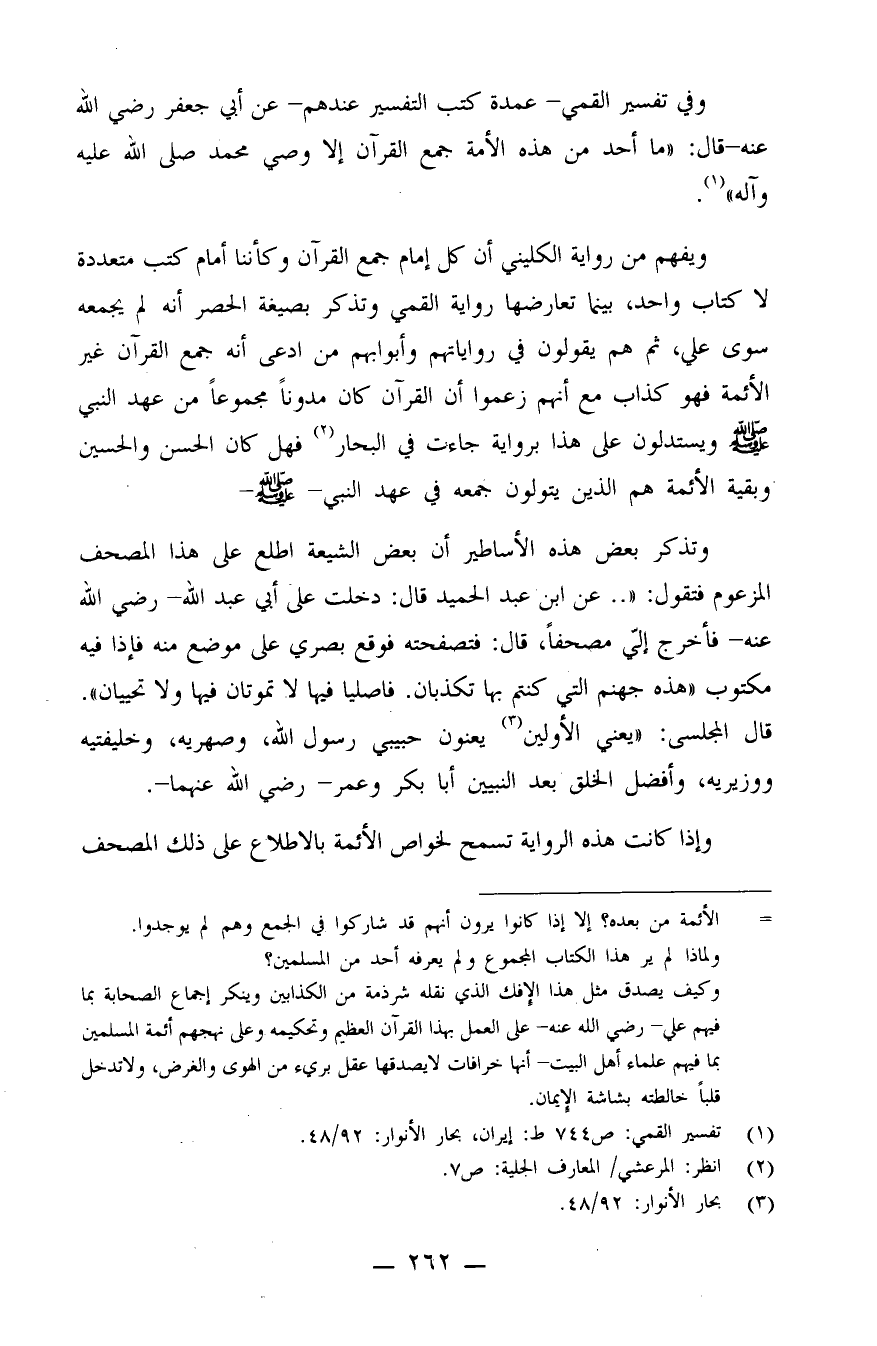 ويفهم من رواية الكليني أن كل إمام جمع القرآن، وكأننا أمام كتب متعددة لا كتاب واحد، بينما تعارضها رواية القمي وتذكر بصيغة الحصر أنه لم يجمعه سوى علي، ثم هم يقولون في رواياتهم وأبوابهم: من ادعى أنه جمع القرآن غير الأئمة فهو كذاب. مع أنهم زعموا أن القرآن كان مدوناً مجموعاً من عهد النبي صلى الله عليه وسلم ويستدلون على هذا برواية جاءت في البحار (¬2) . فهل كان الحسن والحسين وبقية الأئمة هم الذين يتولون جمعه في عهد النبي صلى الله عليه وسلم؟!