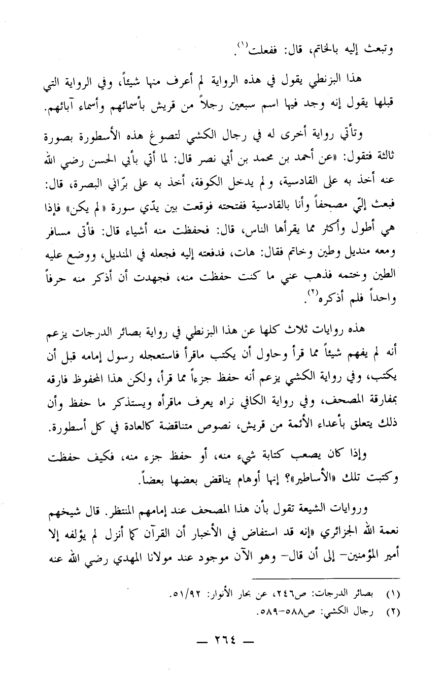 هذه روايات ثلاث كلها عن هذا البزنطي في رواية بصائر الدرجات يزعم أنه لم يفهم شيئاً مما قرأ وحاول أن يكتب ما قرأ فاستعجله رسول إمامه قبل أن يكتب، وفي رواية الكشيء يزعم أنه حفظ جزءاً مما قرأ، ولكن هذا المحفوظ فارقه بمفارقة المصحف، وفي رواية الكافي نراه يعرف ما قرأه ويستذكر ما حفظ، وأن ذلك يتعلق بأعداء الأئمة من قريش. نصوص متناقضة كالعادة في كل أسطورة.