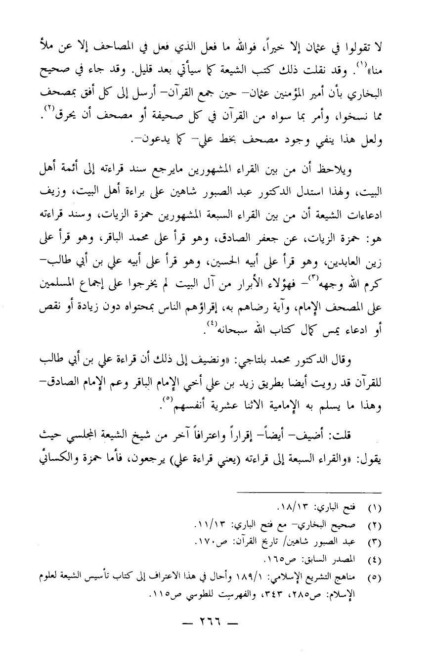 ويلاحظ أن من بين القراء المشهورين ما يرجع سند قراءته إلى أئمة أهل البيت، ولهذا استدل الدكتور عبد الصبور شاهين على براءة أهل البيت، وزيف ادعاءات الشيعة أن من بين القراء السبعة المشهورين حمزة الزيات، وسند قراءته هو: حمزة الزيات، عن جعفر الصادق، وهو قرأ على محمد الباقر، وهو قرأ على زين العابدين، وهو قرأ على أبيه الحسين، وهو قرأ على أبيه علي بن أبي طالب -كرم الله وجه - (¬3) ، فهؤلاء الأبرار من آل البيت لم يخرجوا على إجماع المسلمين على المصحف الإمام، وآية رضاهم به، إقراؤهم الناس بمحتواه دون زيادة أو نقص أو ادعاء يمس كمال كتاب الله سبحانه (¬4) .