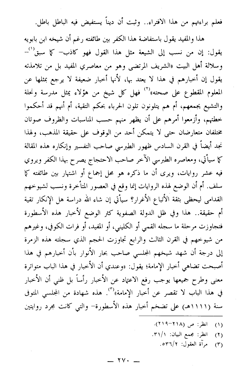 هذا والمفيد يقول باستفاضة هذا الكفر بين طائفته، رغم أن شيخه ابن بابويه يقول: إن من نسب إلى الشيعة مثل هذا القول فهو كاذب - كما سبق (¬1) .- وسلالة أهل البيت (الشريف المرتضى وهو من معاصري المفيد بل من تلامذته يقول: إن أخبارهم في هذا لا يعتد بها، لأنها أخبار ضعيفة لا يرجع بمثلها عن المعلوم المقطوع على صحته) (¬2) . فهل كل شيخ من هؤلاء يمثل ومدرسة ونحلة والتشيع يجمعهم، أو هم يتلونون تلون الحرباء بحكم التقية، أو أنهم قد أحكموا خطتهم، وأزمعوا أمرهم على أن يظهر منهم حسب المناسبات والظروف صوتان مختلفان متعارضان حتى لا يتمكن أحد من الوقوف على حقيقة المذهب؟!