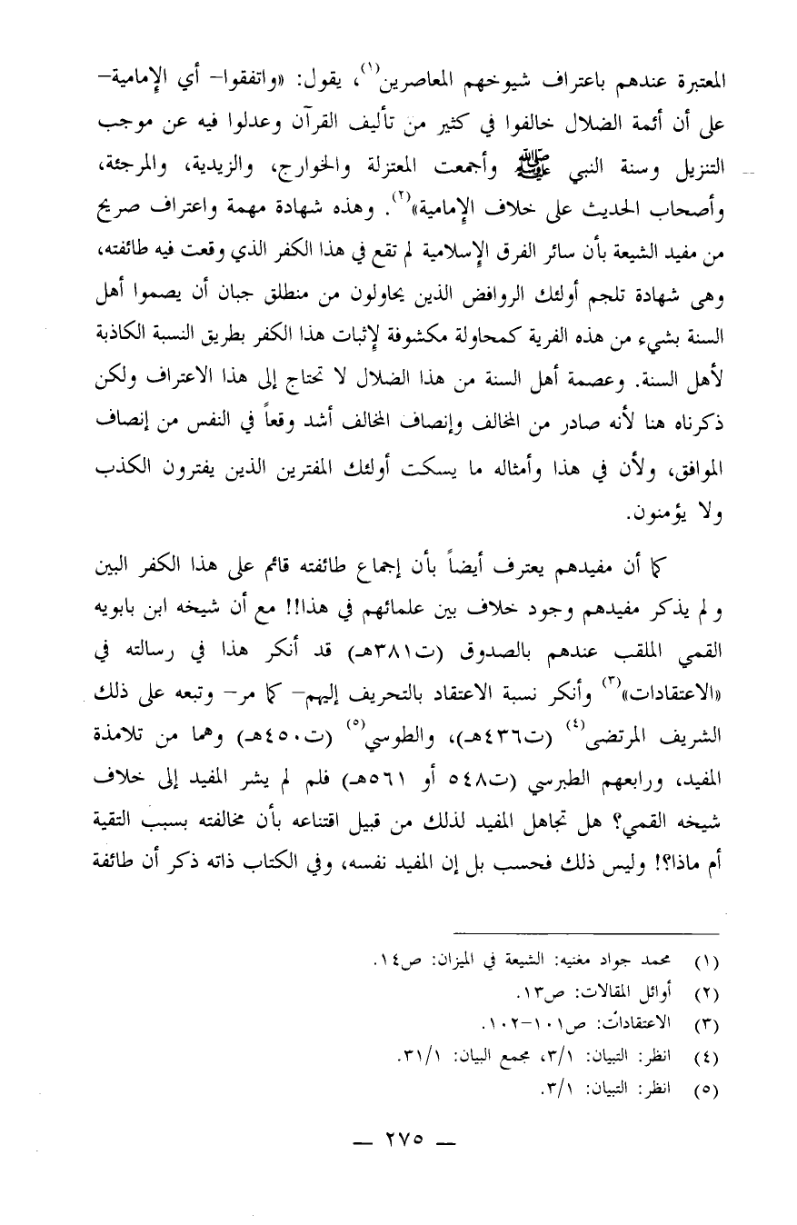 كما أن مفيدهم يعترف أيضاً بأن إجماع طائفته قائم على هذا الكفر البين، ولم يذكر مفيدهم وجود خلاف بين علمائهم في هذا!! مع أن شيخه ابن بابويه القمي الملقب عندهم بالصدوق (ت381هـ) قد أنكر هذا في رسالته في "الاعتقادات" (¬3) . وأنكر نسبة الاعتقاد بالتحريف إليهم - كما مر -، وتبعه على ذلك الشريف المرتضى (¬4) . (ت436هـ) ، والطوسي (¬5) . (ت450هـ) وهما من تلامذة المفيد، ورابعهم الطبرسي (ت548 أو561هـ) فلِمَ لَمْ يشر المفيد إلى خلاف شيخه القمي؟ هل تجاهل المفيد لذلك من قبيل اقتناعه بأن مخالفته بسبب التقية أو ماذا؟! وليس ذلك فحسب بل إن المفيد نفسه، وفي الكتاب ذاته ذكر أن طائفة