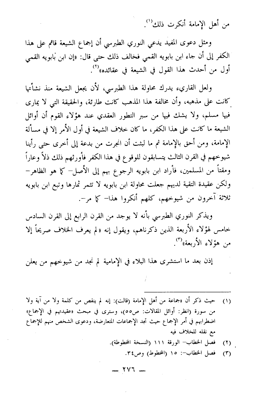 ومثل دعوى المفيد يدعي النوري الطبرسي أن إجماع الشيعة قائم على هذا الكفر، إلى أن جاء ابن بابويه القمي فخالف ذلك حتى قال: "إن ابن بابويه القمي أول من أحدث هذا القول في الشيعة في عقائده" (¬2) .