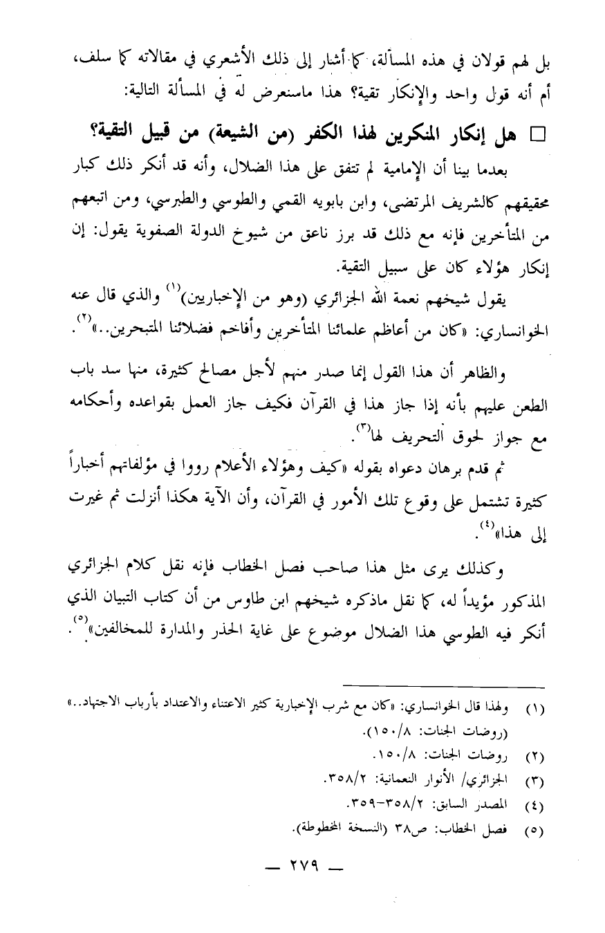 بعدما بيّنا أن الأمامية لم تتفق على هذا الضلال، وأنه قد أنكر ذلك كبار محققيهم كالشريف المترضى، وابن بابويه القمي والطوسي والطبرسي، ومن اتبعهم من المتأخرين، فإنه مع ذلك قد برز ناعق من شيوخ الدولة الصفوية يقول: إن إنكار هؤلاء كان على سبيل التقية.