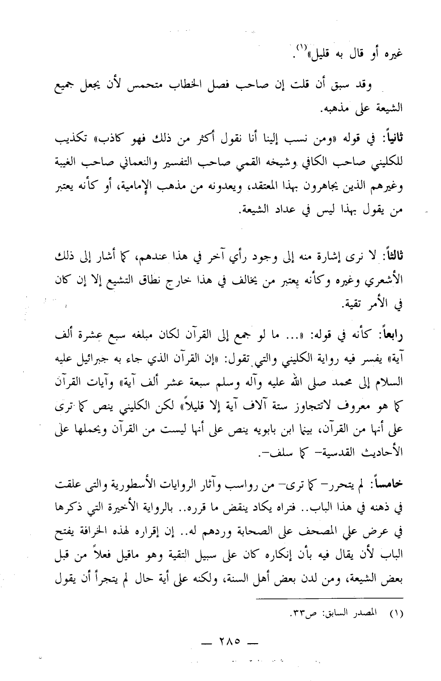 ثانياً: في قوله: "ومن نسب إلينا أنا نقول أكثر من ذلك فهو كاذب" تكذيب للكليني صاحب الكافي وشيخه القمي صاحب التفسير والنعماني صاحب الغيبة وغيرهم الذين يجاهرون بهذا المعتقد، ويعدونه من مذهب الإمامية، أو كأنه يعتبر من يقول بهذا ليس في عداد الشيعة.