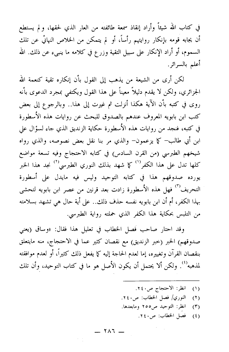 لكن أرى من الشيعة من يذهب إلى القول بأن إنكاره تقية كنعمة الله الجزائري، ولكن لا يقدم دليلاً معيناً على هذا القول، ويكتفي بمجرد الدعوى بأنه روى في كتبه بأن الآية هكذا أنزلت ثم غيرت إلى هذا.. وبالرجوع إلى بعض كتب ابن بابويه المعروف عندهم بالصدوق للبحث عن روايات هذه الأسطورة في كتبه، فنجد من روايات هذه الأسطورة حكاية الزنديق الذي جاء لسؤال علي بن أبي طالب - كما يزعمون - والذي مر بنا نقل بعض نصوصه، والذي رواه شيخهم الطبرسي (من القرن السادس) في كتابه الاحتجاج وفيه تسعة مواضع كلها تدل على هذا الكفر (¬1) . كما شهد بذلك النوري الطبرسي (¬2) ، نجد أن هذا الخبر يورده صدوقهم هذا في كتابه التوحيد وليس فيه ما يدل على أسطورة التحريف (¬3) . فهل هذه الأسطورة زادت بعد قرنين من عصر ابن بابويه لتحشى بهذا الكفر، أو أن ابن بابويه نفسه حذف ذلك.. على آية حال هي تشهد بسلامته من التلبس بحكاية هذا الكفر الذي حملته رواية الطبرسي.