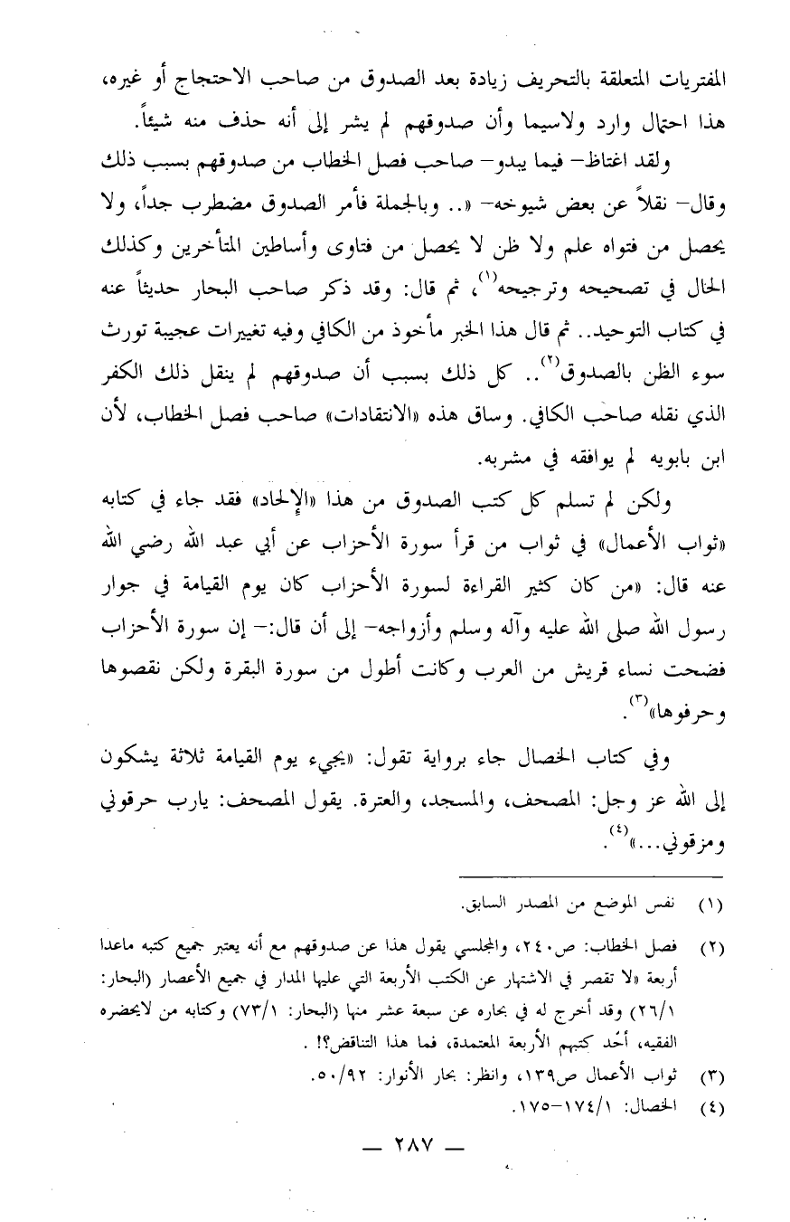 (¬2) فصل الخطاب: ص 240، والمجلسي يقول هذا عن صدوقهم مع أنه يعتبر جميع كتبه ما عدا أربعة "لا تقصر في الاشتهار عن الكتب الأربعة التي عليها المدار في جميع الأعصار" (البحار: 1/26) وقد أخرج له في بحاره عن سبعة عشر منها (البحار: 1/73) وكتابه من لا يحضره الفقيه، أحد كتبهم الأربعة المعتمدة، فما هذا التناقض؟!