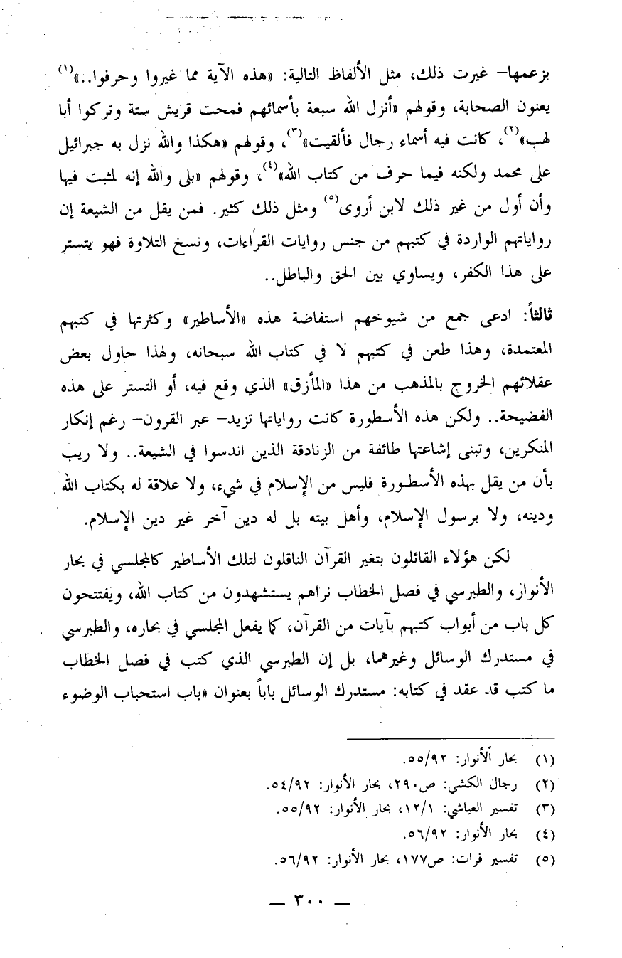 ثالثاً: ادعى جمع من شيوخهم استفاضة هذه "الأساطير" وكثرتها في كتبهم المعتمدة، وهذا طعن في كتبهم لا في كتاب الله سبحانه، ولهذا حاول بعض عقلائهم الخروج بالمذهب من هذا "المأزق" الذي وقع فيه، أو التستر على هذه الفضيحة.. ولكن هذه الأسطورة كانت رواياتها تزيد - عبر القرون - رغم إنكار المنكرين، وتبنى إشاعتها طائفة من الزنادقة الذين اندسوا في الشيعة.. ولا ريب بأن من يقل بهذه الأسطورة فليس من الإسلام في شيء، ولا علاقة له بكتاب الله ودينه، ولا برسول الإسلام وأهل بيته، بل له دين آخر غير دين الإسلام.