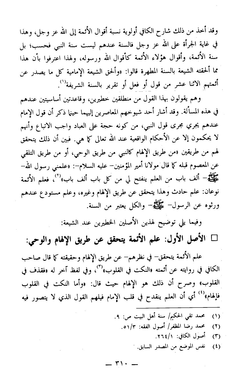فبين أن ذلك يتحقق لهم من طريقين "من طريق الإلهام كالنبي من طريق الوحي، أو من طريق التلقي عن المعصوم قبله كما قال مولانا أمير المؤمنين - عليه السلام -: "علمني رسول الله صلى الله عليه وسلم ألف باب من العلم ينفتح لي من كل باب ألف باب" (¬2) ، فعلم الأئمة نوعان: علم حادث وهذا يتحقق عن طريق الإلهام وغيره، وعلم مستودع عندهم ورثوه عن الرسول صلى الله عليه وسلم، والكل يعتبر من السنة.