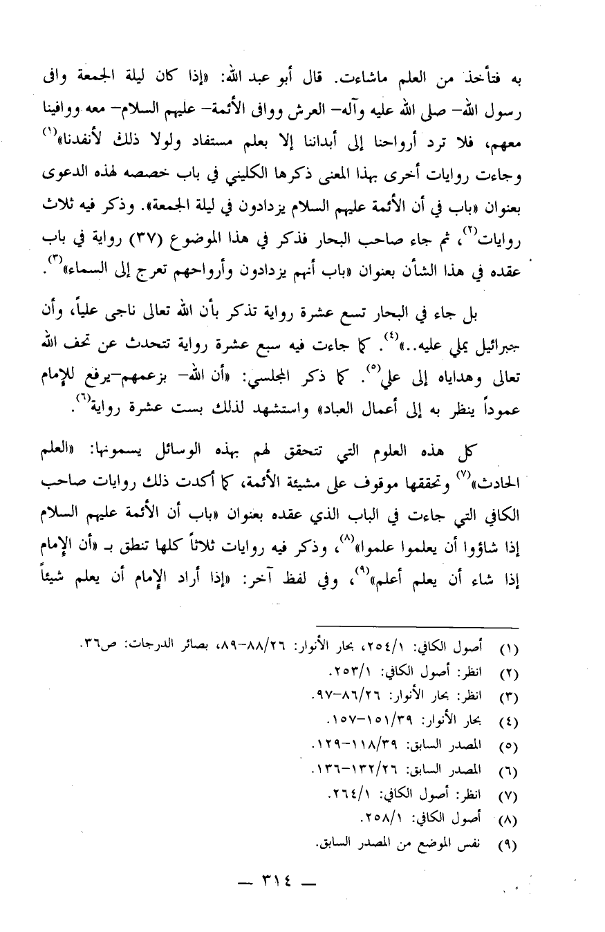 وجاءت روايات أخرى بهذا المعنى ذكرها الكليني في باب خصصه لهذه الدعوى بعنوان: "باب في أن الأئمة عليهم السلام يزدادون في ليلة الجمعة". وذكر فيه ثلاث روايات (¬2) ، ثم جاء صاحب البحار فذكر في هذا الموضوع (37) رواية في باب عقده في هذا الشأن بعنوان: "باب أنهم يزدادون وأرواحهم تعرج إلى السماء" (¬3) .
