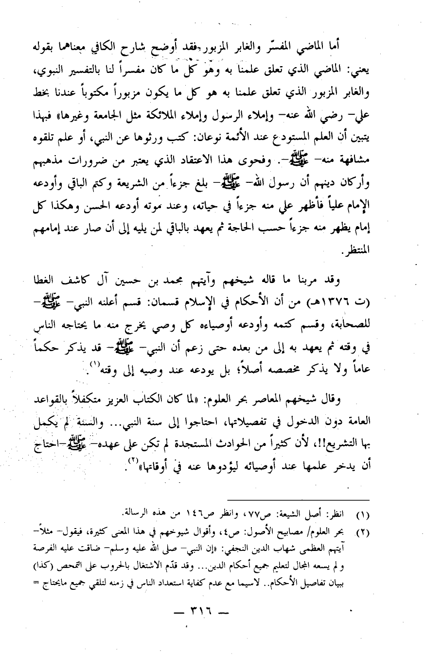 (¬2) بحر العلوم/ مصابيح الأصول: ص 4، وأقوال شيوخهم في هذا المعنى كثيرة، فيقول - مثلاً - آيتهم العظمى شهاب الدين النجفي: "إن النبي صلى الله عليه وسلم ضاقت عليه الفرصة ولم يسعه المجال لتعليم جميع أحكام الدين.. وقد قدّم الاشتغال بالحروب على التمحص (كذا) ببيان تفاصل الأحكام.. لاسيما مع عدم كفاية استعداد الناس في زمنه لتلقي جميع ما يحتاج =