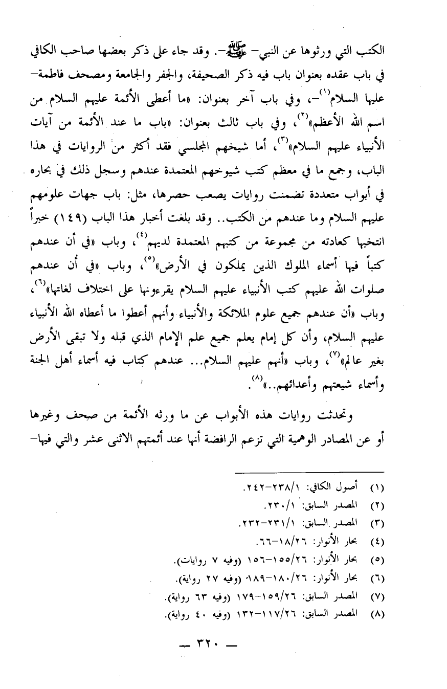 أما شيخهم المجلسي فقد أكثر من الروايات في هذا الباب، وجمع ما في معظم كتب شيوخهم المعتمدة عندهم، وسجل ذلك في بحاره في أبواب متعددة تضمنت روايات يصعب حصرها، مثل: "باب جهات علومهم عليهم السلام وما عندهم من الكتب.."، وقد بلغت أخبار هذا الباب (149) خبراً انتخبها كعادته من مجموعة من كتبهم المعتمدة لديهم (¬4) ، وباب "في أن عندهم كتباً فيها أسماء الملوك الذين يملكون في الأرض" (¬5) ، وباب "في أن عندهم صلوات الله عليهم كتب الأنبياء عليهم السلام يقرءونها على اختلاف لغاتها" (¬6) ، وباب "أن عندهم جميع علوم الملائكة والأنبياء وأنهم أعطوا ما أعطاه الله الأنبياء عليهم السلام، وأن كل إمام يعلم جميع علم الإمام الذي قبله ولا تبقى الأرض بغير عالم" (¬7) ، وباب "أنهم عليهم السلام.. عندهم كتاب فيه أسماء أهل الجنة وأسماء شيعتهم وأعدائهم" (¬8) .